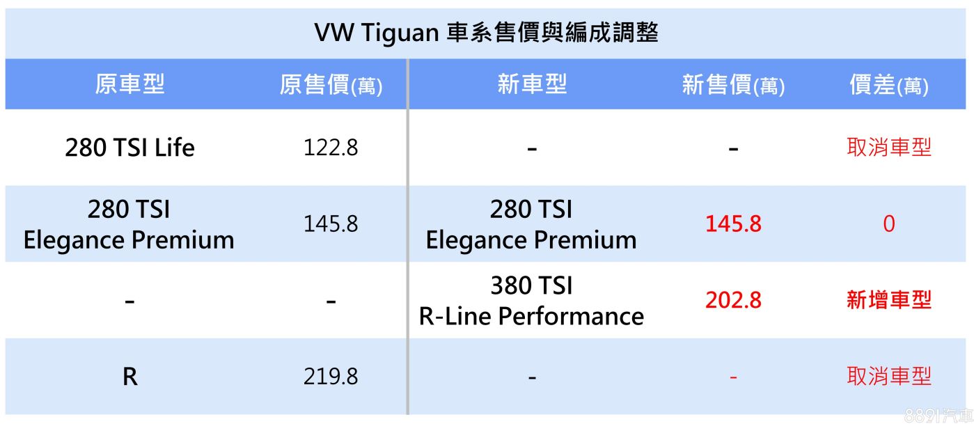 福斯中型休旅Tiguan,稍早針對國內編成進行調整,下架了原入門款280 TSI Life和Tiguan R性能車型,並新增一款380 TSI車型擔綱新頂規,車系也因而從三車型陣容縮減為三車型編成。