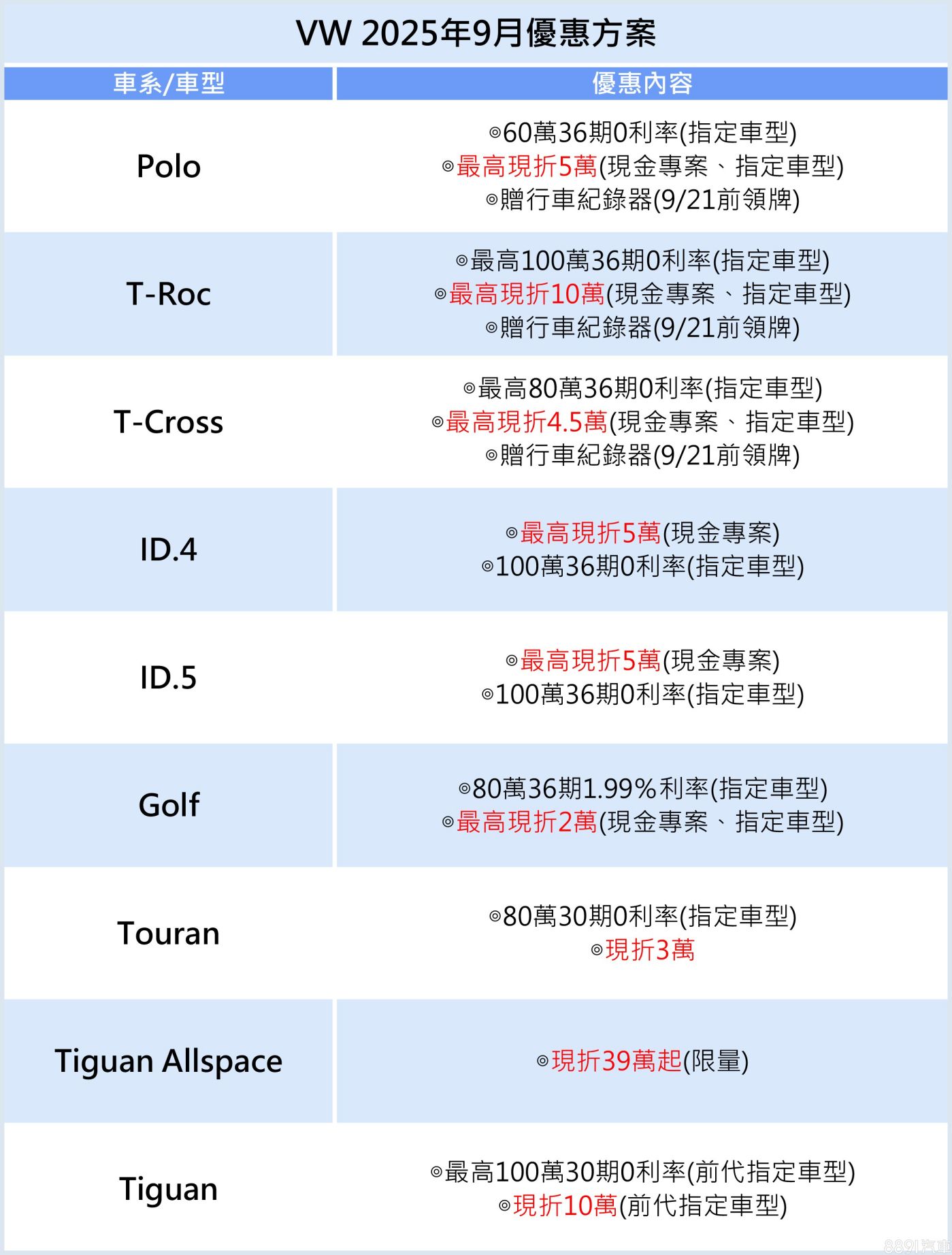 9月VW福斯都會小車,包含Polo、T-Cross、T-Roc車系指定車型,均有多重好康,除了高額分期0利率,若採用現金專案,最高現折10萬,若於9/21前領牌,再贈送德國原廠超感光前後鏡頭行車紀錄器!