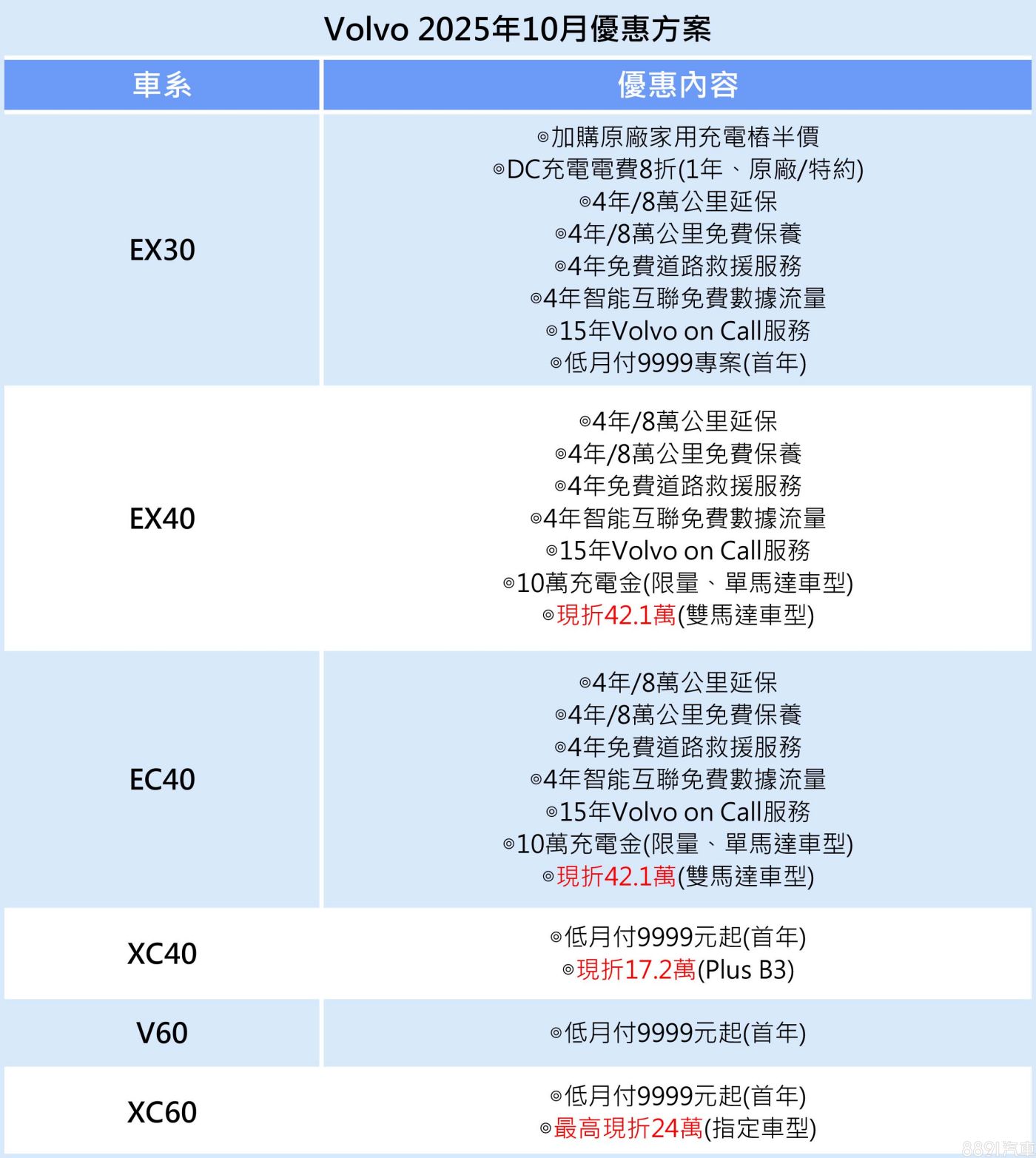 純電產品也針對EX40、EC40,祭出實惠的現金優惠,雙車系頂規的Ultra Twin motor車型,均現折42.1萬元,179.9萬即可買到;入門的Plus Single motor則能享有限量提供的10萬充電金回饋。另入主EX30、EX40、EC40,都提供4年/8萬公里延保、免費保養,以及4年免費道路救援、互聯免費數據流量,和15年Volvo on Call服務等。