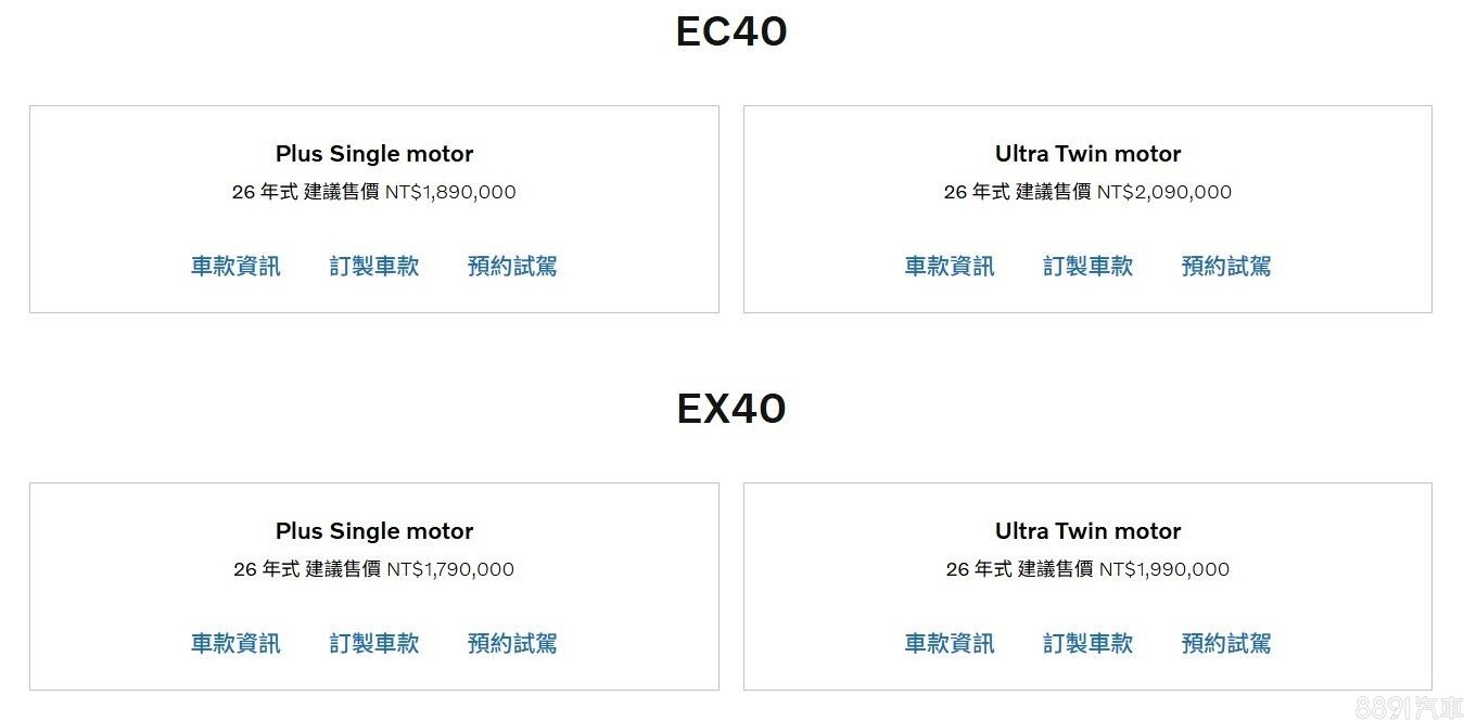 Volvo在11月購車方案公布了26年式EX40與EC40價格,雙車型降幅一致,「Plus Single motor」單馬達版降12萬,而「Ultra Twin motor」雙馬達版降23萬。雖然Volvo國內官網仍未更新至MY26規格配備表,據銷售端透露此次新年式僅為純降價,配備方面並未調整,後續請依官方公告為準。