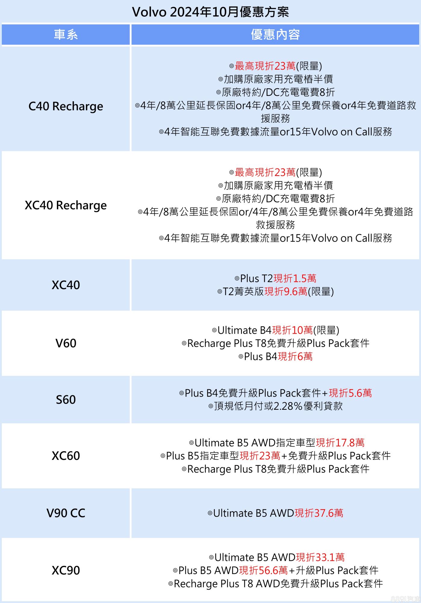 其餘車系指定車型則有著1.5至37.6萬不等的現金折扣,純電版本如C40 Recharge、XC40 Recharge等,另可享加購原廠家用充電樁半價、原廠特約/DC充電電費8折、延長保固、免費保養、免費道路救援服務等。
