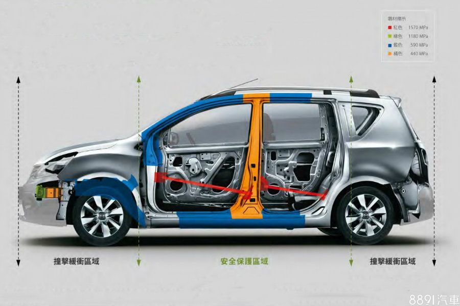 安全輔助部分,原廠特別採用潰縮緩衝撞擊設計來打造車體,並加寬前保桿鋼樑,同時增加車門防撞鋼材強度,除了可抵擋更多衝擊能量,亦能將撞擊力道分散,此外,全車系標配ABS、EBD、BAS、BOS、倒車雷達等項目,被動安全則比較令人遺憾,無論何種車型,均為2氣囊配置。