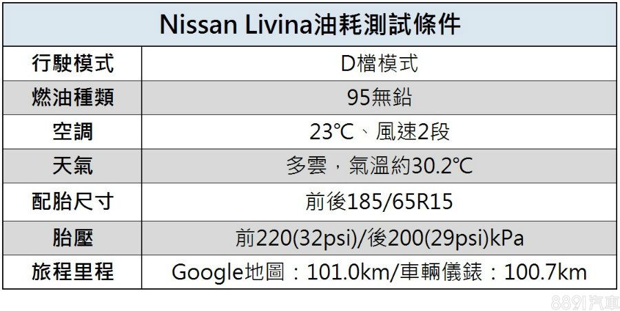 Livina的車高偏高增加風阻,車重也是同級最重,看來不利於油耗的表現,同級對手的能源局公布平均油耗,大約多落在18~17km/L間,確實這點也反應在數據上,不過最終實測得到15.18km/L,雖然比不上能源局數值,但還不算差。