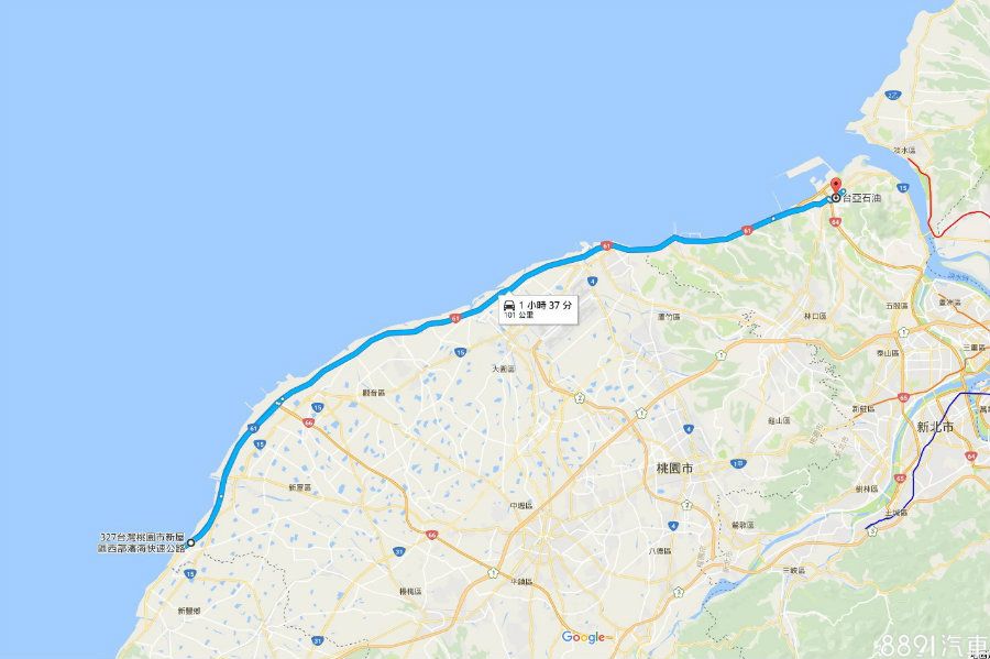 油耗路線起點與終點皆為台亞八里台北港加油站,來回均行經61西濱快速道路沿線,折返點設定為桃園新屋的莫內咖啡,經Google地圖推估的里程為101km。