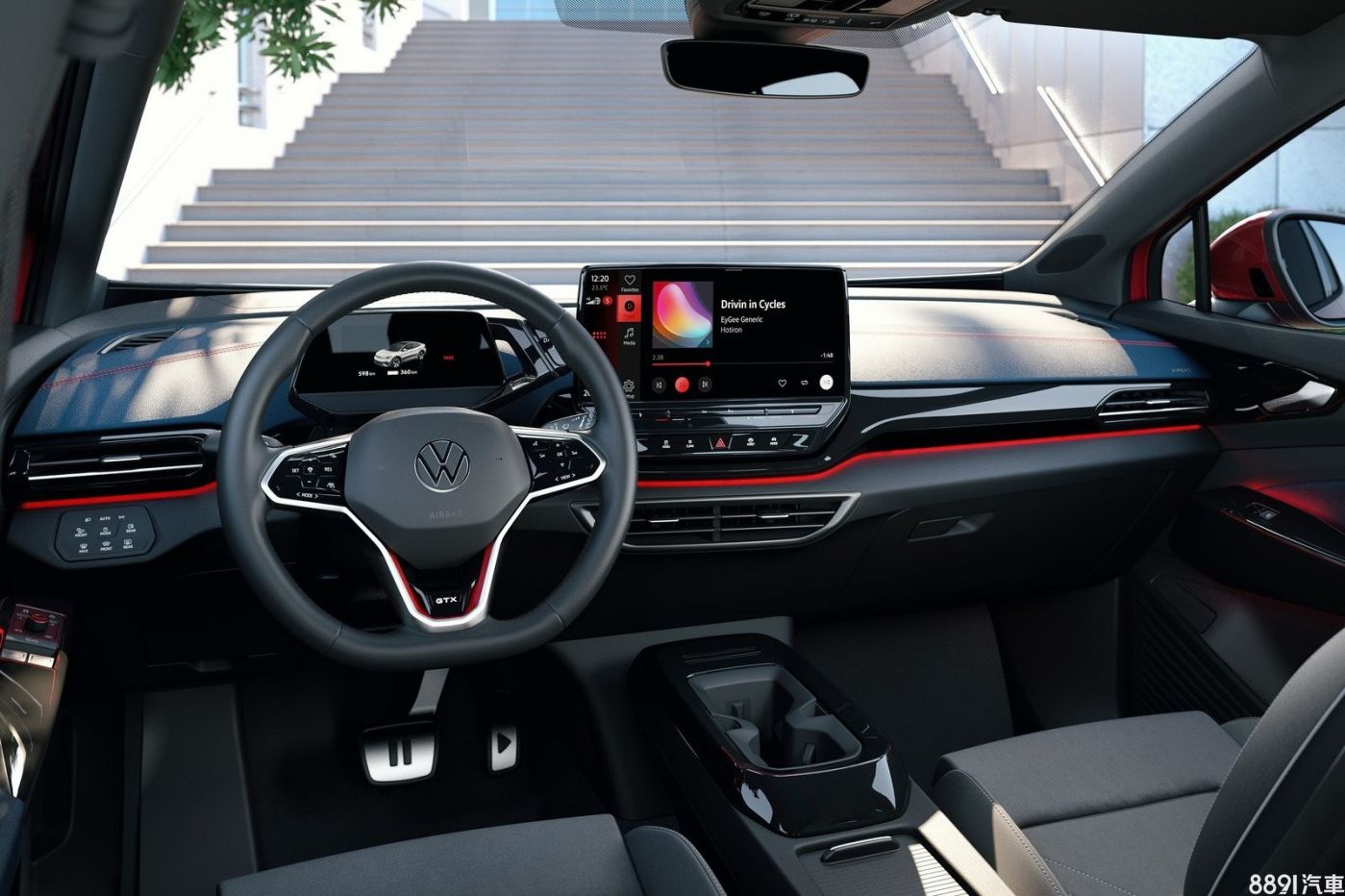 車室格局幾乎與ID.3、ID.4如出一轍,採用簡約與橫向鋪陳,排檔配置於方向盤右側後方,導入數位儀錶與中控觸控式多媒體系統、30色氛圍燈、HUD抬頭顯示幕等配備。ID.5 GTX則透過紅色色調、專屬方向盤、金屬踏板等配置,呼應外觀運動氣息。