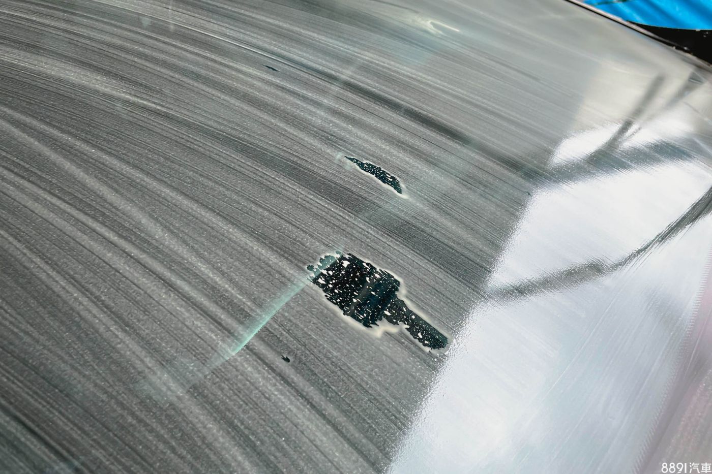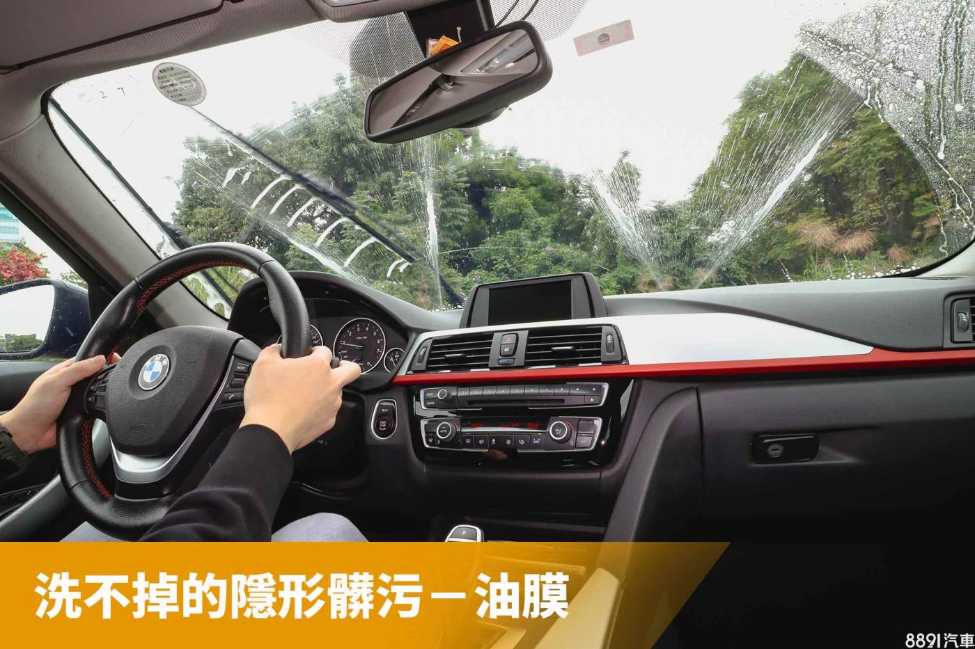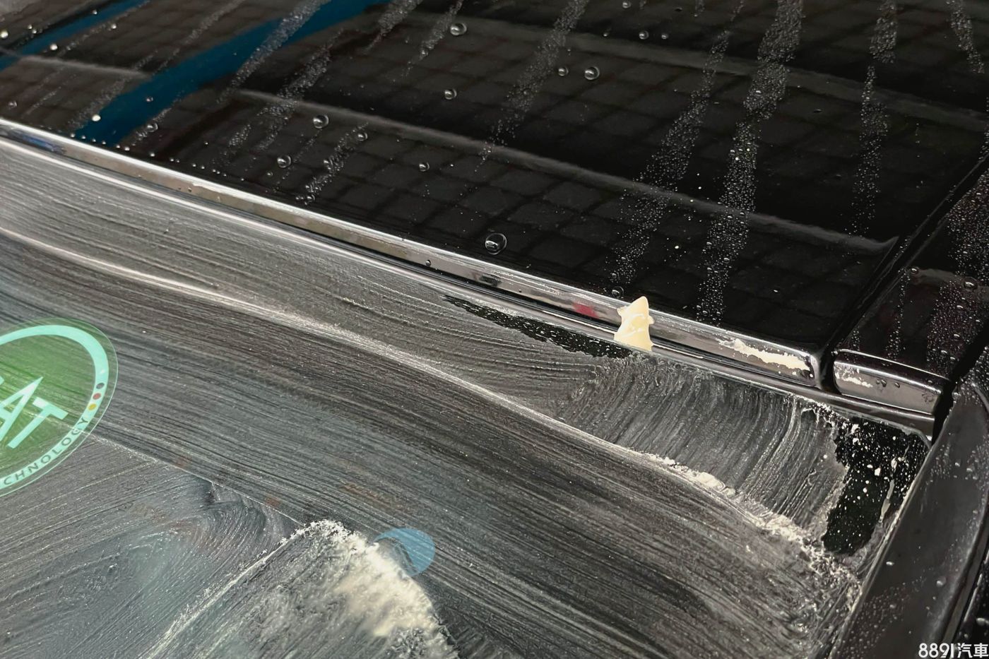除油膜第一步先從洗車開始,個人習慣會先將全車包含玻璃清洗乾淨,避免砂石、髒污可能在接下來研磨過程中造成刮傷。照片中可以看到玻璃呈現疏水狀態,會將水不規則排開,還有雨刷刷過的痕跡也都一清二楚,這些跡象便表明玻璃有層厚厚的油膜。