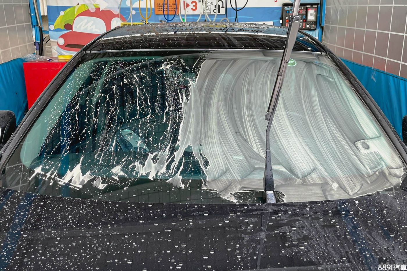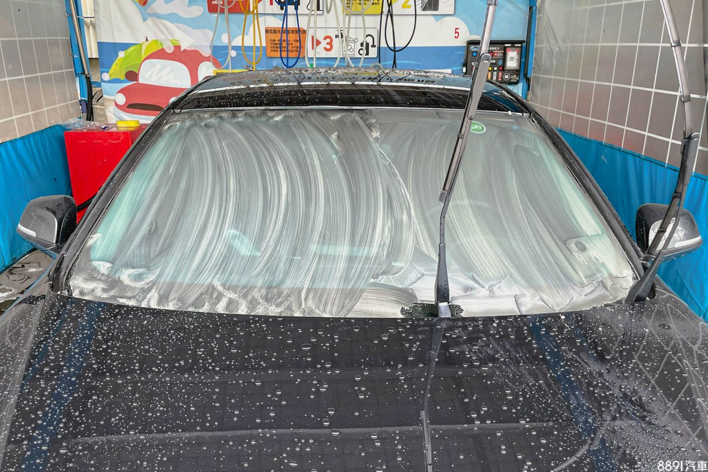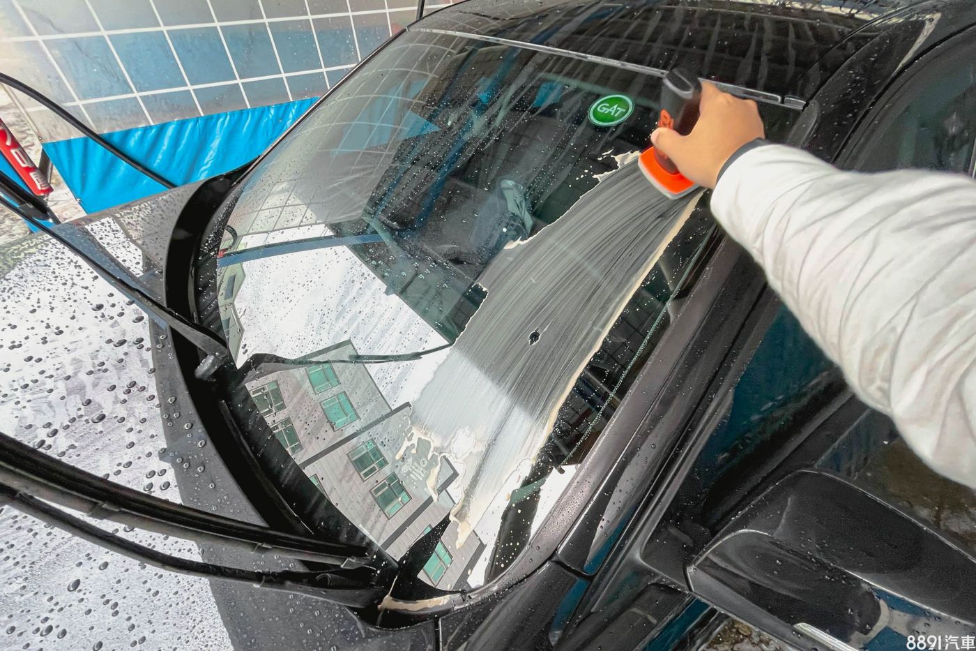 整面前檔玻璃都仔細擦拭,呈現親水狀態之後便可以拿高壓水槍沖洗乾淨。