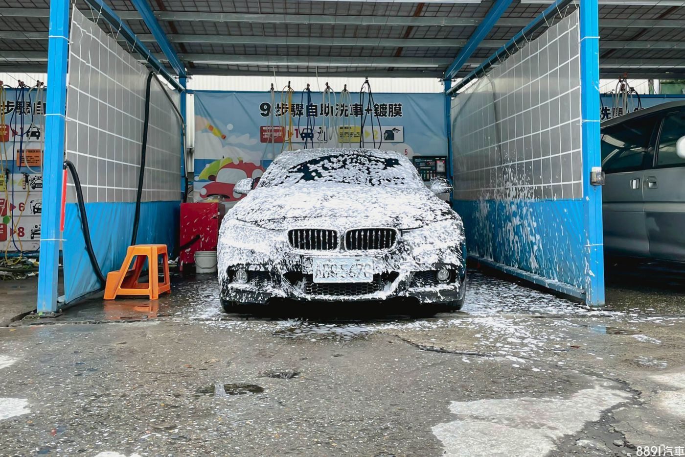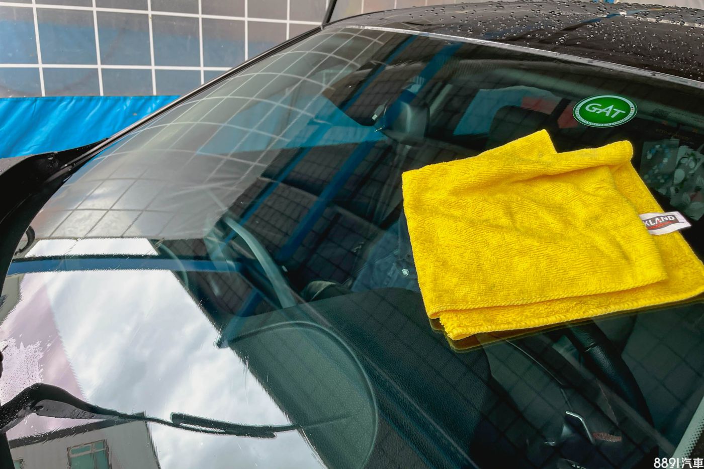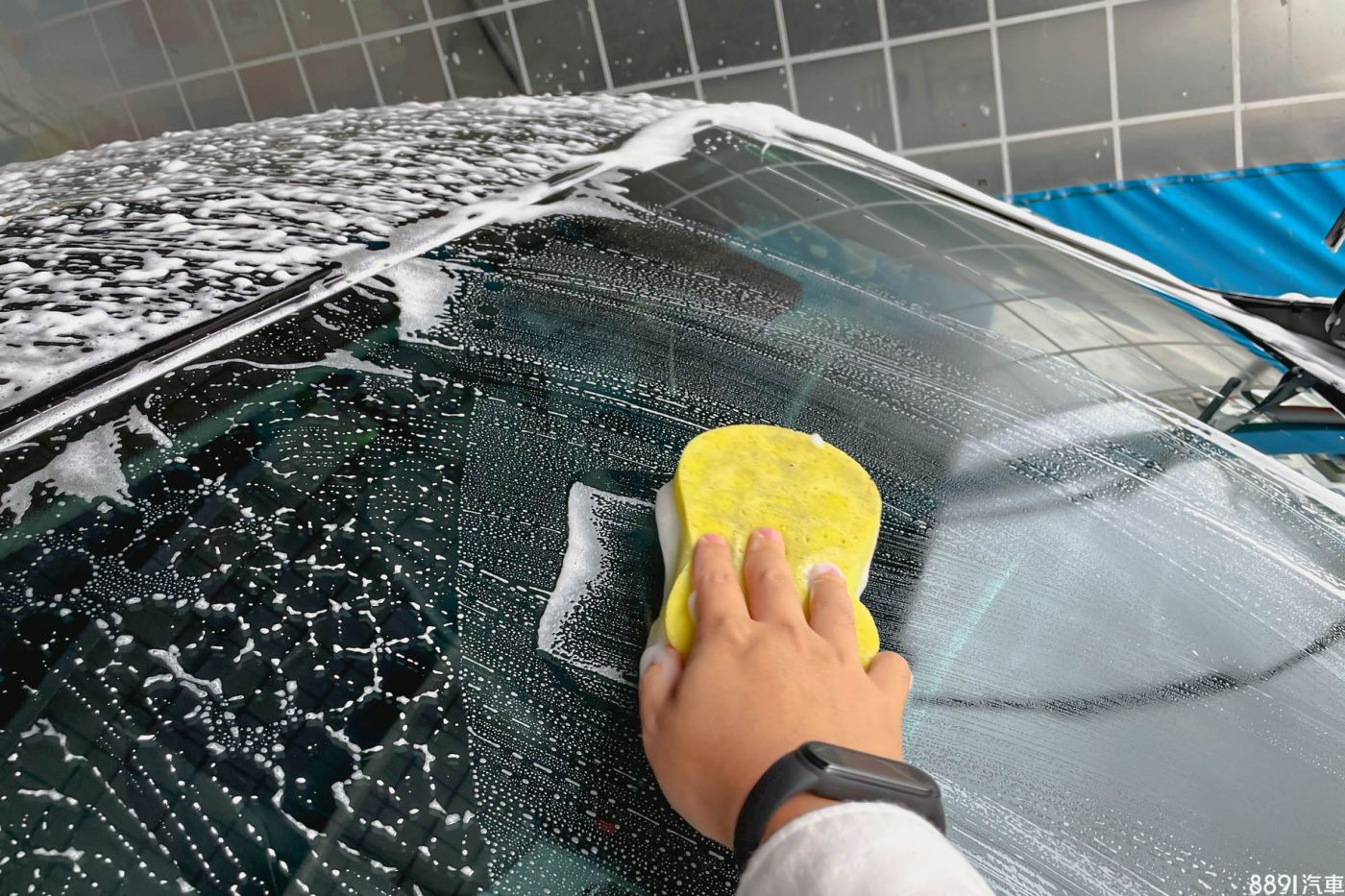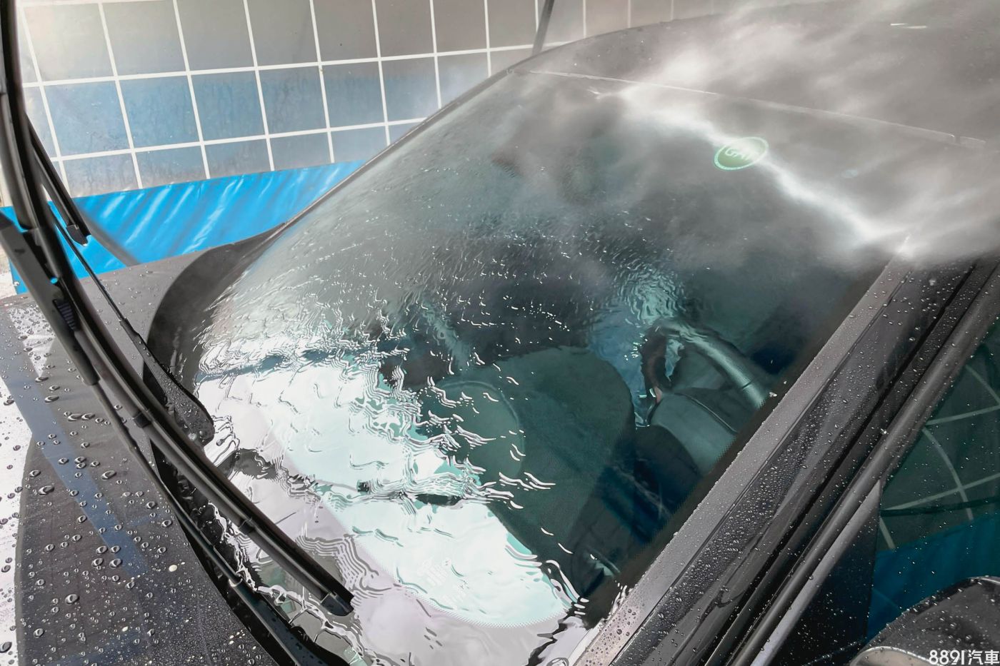 整面前檔玻璃都仔細擦拭,呈現親水狀態之後便可以拿高壓水槍沖洗乾淨。