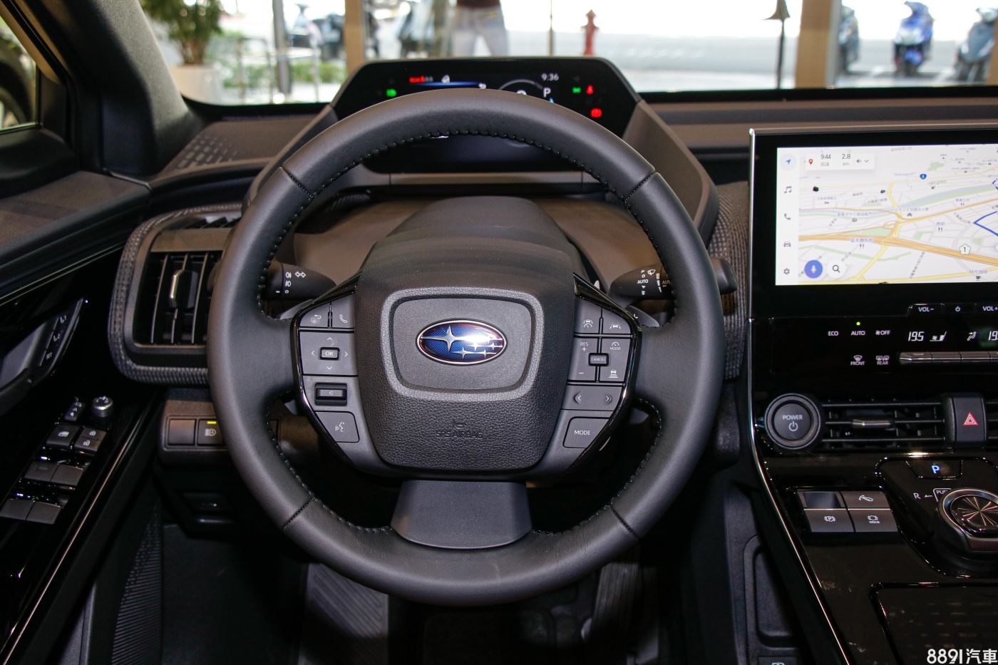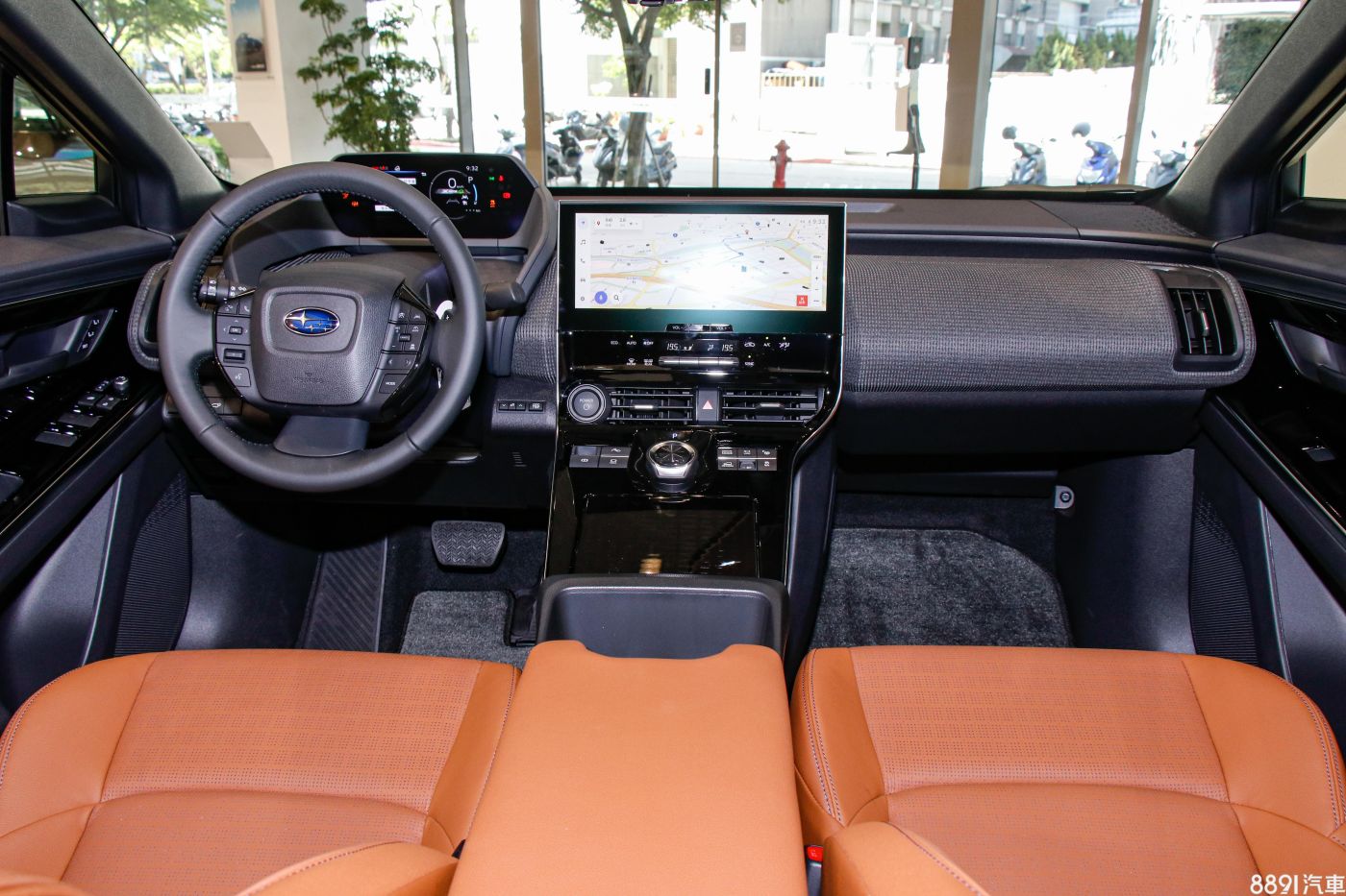 Solterra車內與bZ4X如出一轍,採用駕駛者導向布局,簡潔的水平線條、無遮罩的儀錶板以及兩角三角窗,駕駛視野相當理想,而國內販售的版本統一搭配駝色內裝,儀錶臺也運用織布包覆,觸摸質感細緻。