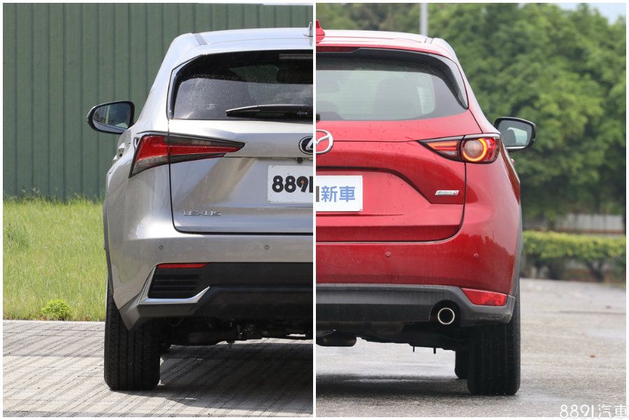而CX-5則有濃厚的「魂動」樣貌,細看之下可以發掘CX-5在用料材質還頗為精緻,並將燈具縮小化,使視覺上看似簡單俐落,而整體車身折線與NX對比之下顯得圓潤,尤其到了車尾部最為明顯,不過NX200入門兩車型為17吋鋁圈,頂規CX-5則踩著19吋大腳,氣勢上也不落人後太多。