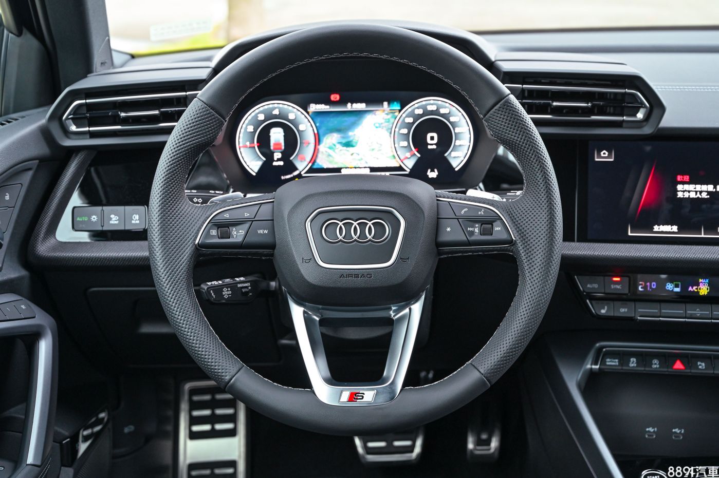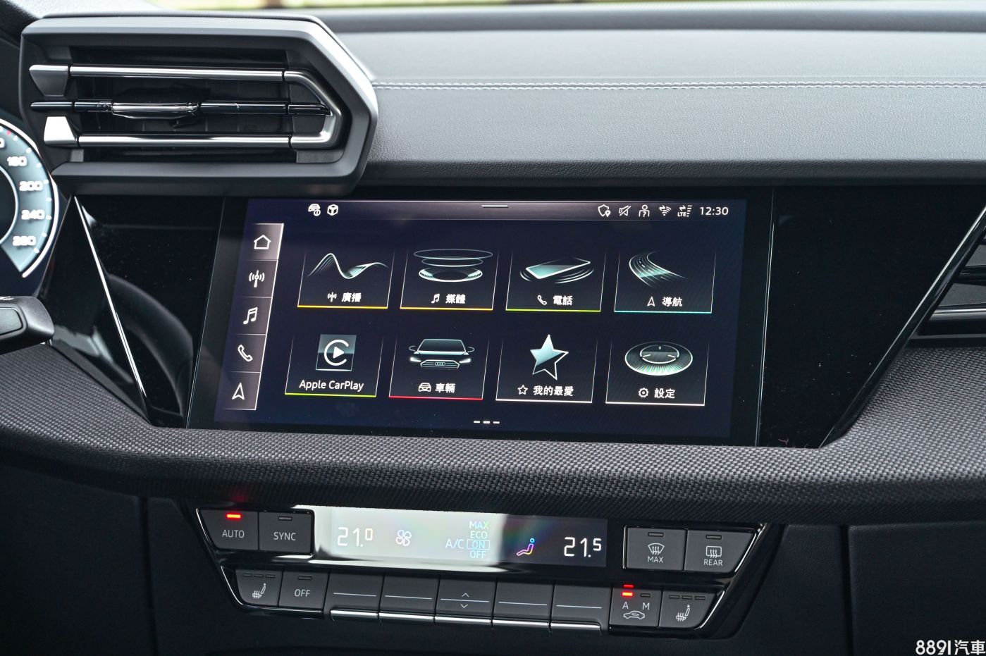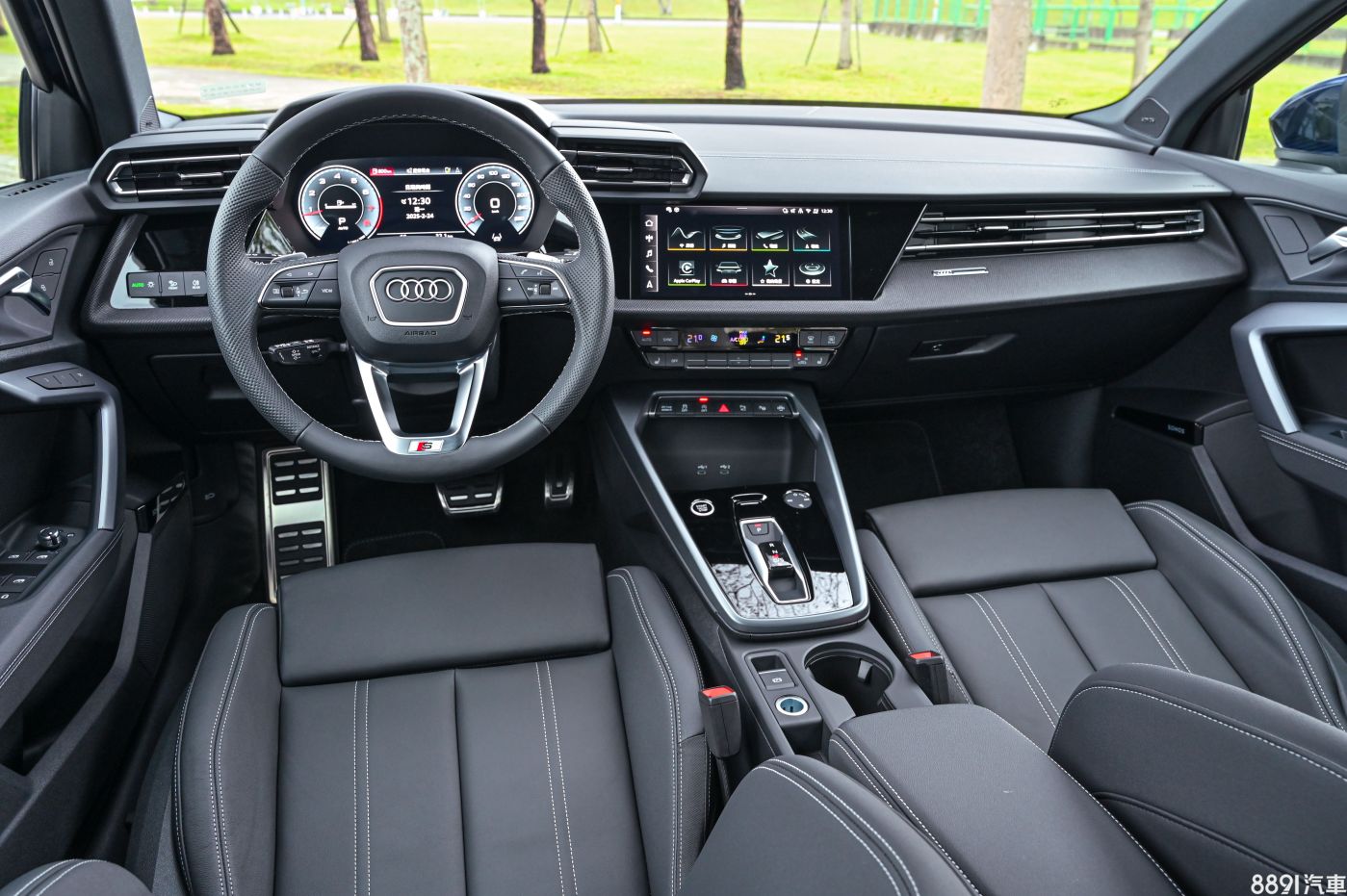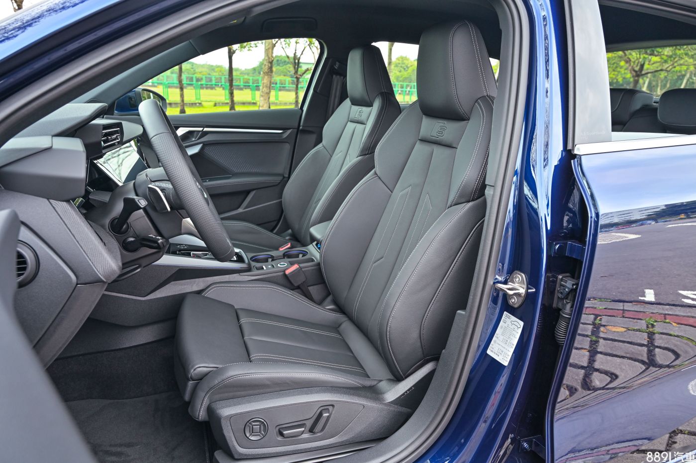這次試駕的S line版本,內裝與一般版本的區別除了專屬方向盤,內裝色系搭配也已深色系為主,有黑色頂棚,搭配這次小改款新增的Dinamica微纖維材料飾板,看起來有碳纖維的感覺,摸起來卻是織布的細膩滑順觸感,這有讓豪華感加分。 小改款A3從入門款就配置雙前座電動座椅,中階以上有記憶、電熱功能,來到本次試駕的S line椅型會更有運動感,在腰部、肩部加強包覆,椅背上還有銘牌加持,心靈馬力瞬間增加不少。