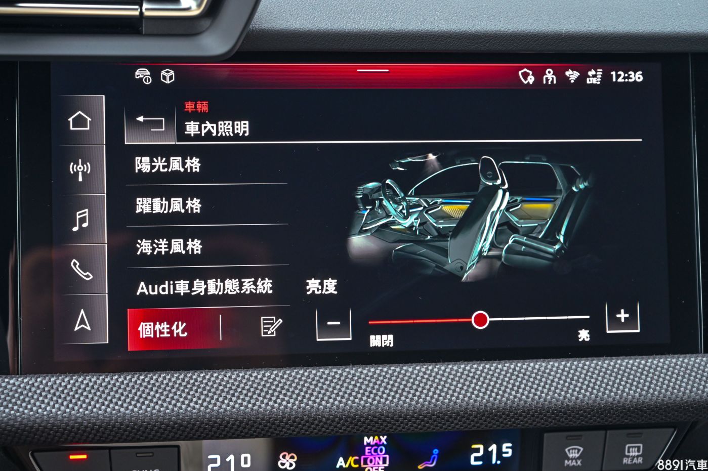 如果進階選配Ambient lighting package pro的話,在門板處燈光效果會更精采,車門布料面板300次鐳射切割,亮起來形成五段漸變光效果,有夠騷包,只可惜當天試駕車沒有選配,沒親眼驗證這華麗的效果。 氣氛燈除了內建的幾種主題,也可以進到個性化選單自由調配,一共有30種顏色可以選擇。