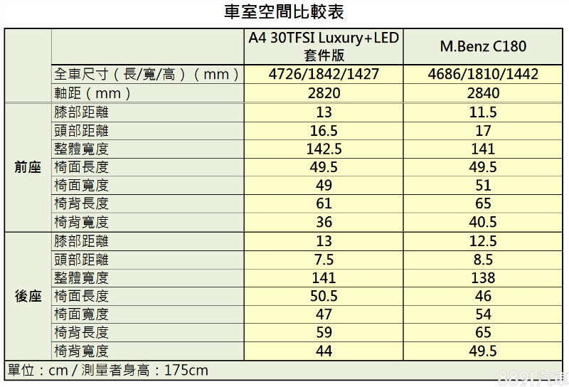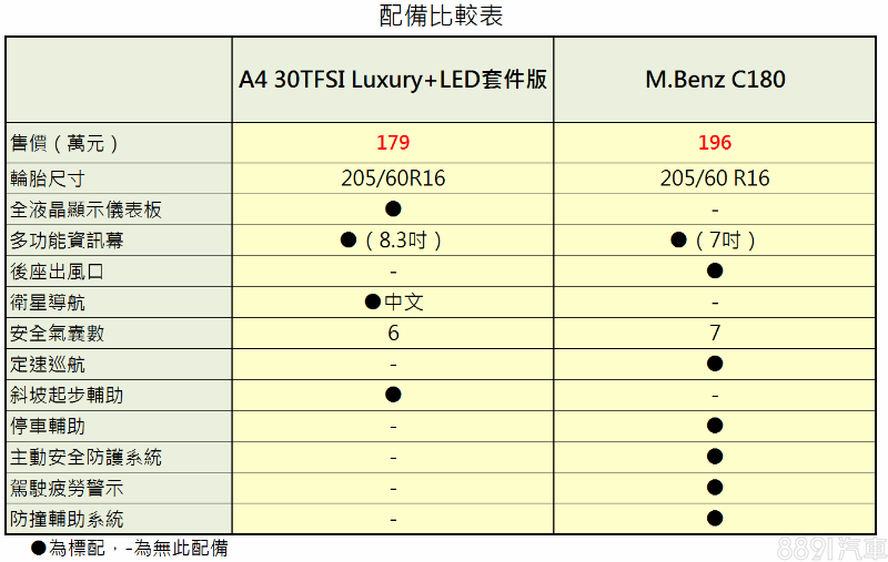 至於另一對手C-Class,現行W205世代在2015年問世,為M.Benz新一代家族風格開創者,引領著S-Class與E-Class設計走向,自然成為A4最佳競爭者。事實上C-Class銷售最佳版本為C200,配置184hp馬力的2.0升渦輪引擎,並提供Avantgarde與Exclusive兩種版本,車價分別為217、228萬元,無論是動力或價格區間均A4 40TFSI同級,但A4目前反應最佳的版本為30TFSI,而畢竟這回主角是A4(畢竟是新秀,總得秤秤斤兩),因此C-Class派出售價196萬元、採用1.6升渦輪引擎的C180,無論是動力或價格,都與A4 30TFSI直接對上,這場四環與三星的入門豪華入門對決,就先從配備與空間開始比劃!