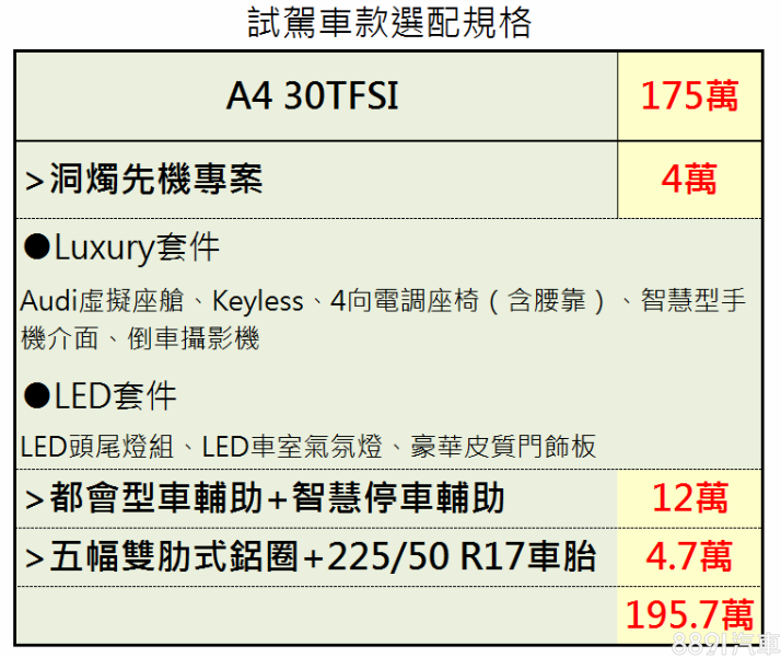 A4 30TFS其擁有的直覺性內裝在未加選套件的情況下,175萬的價格也較C180來的親民,若只選擇LED Package與Luxury Package兩套件,不但外觀氣勢提升、可感受到Audi全數位虛擬座艙帶來的科技感與實用性,且只需加價4萬元,是一筆划算到爆表的交易!若再比照這部試乘車選配都會行車輔助、停車輔助套件和17吋鋁圈,科技便利性已超過其入門定位該有的實力,總價195.7萬也與C180的196萬十分相近,若非一定要雙B的死忠支持者,A4 30TFSI無論加選套件與否,都有著誘人的各項優勢。