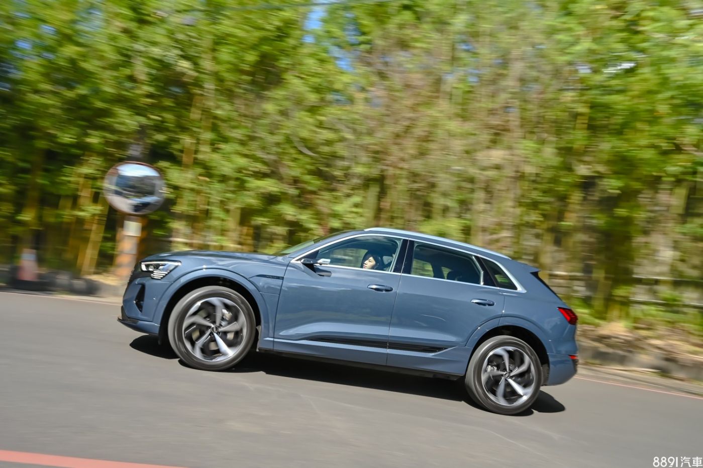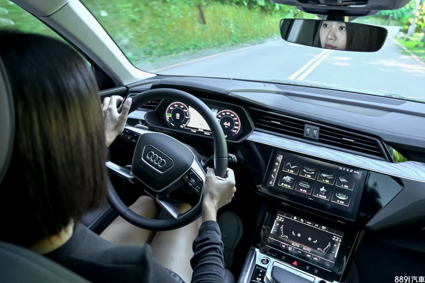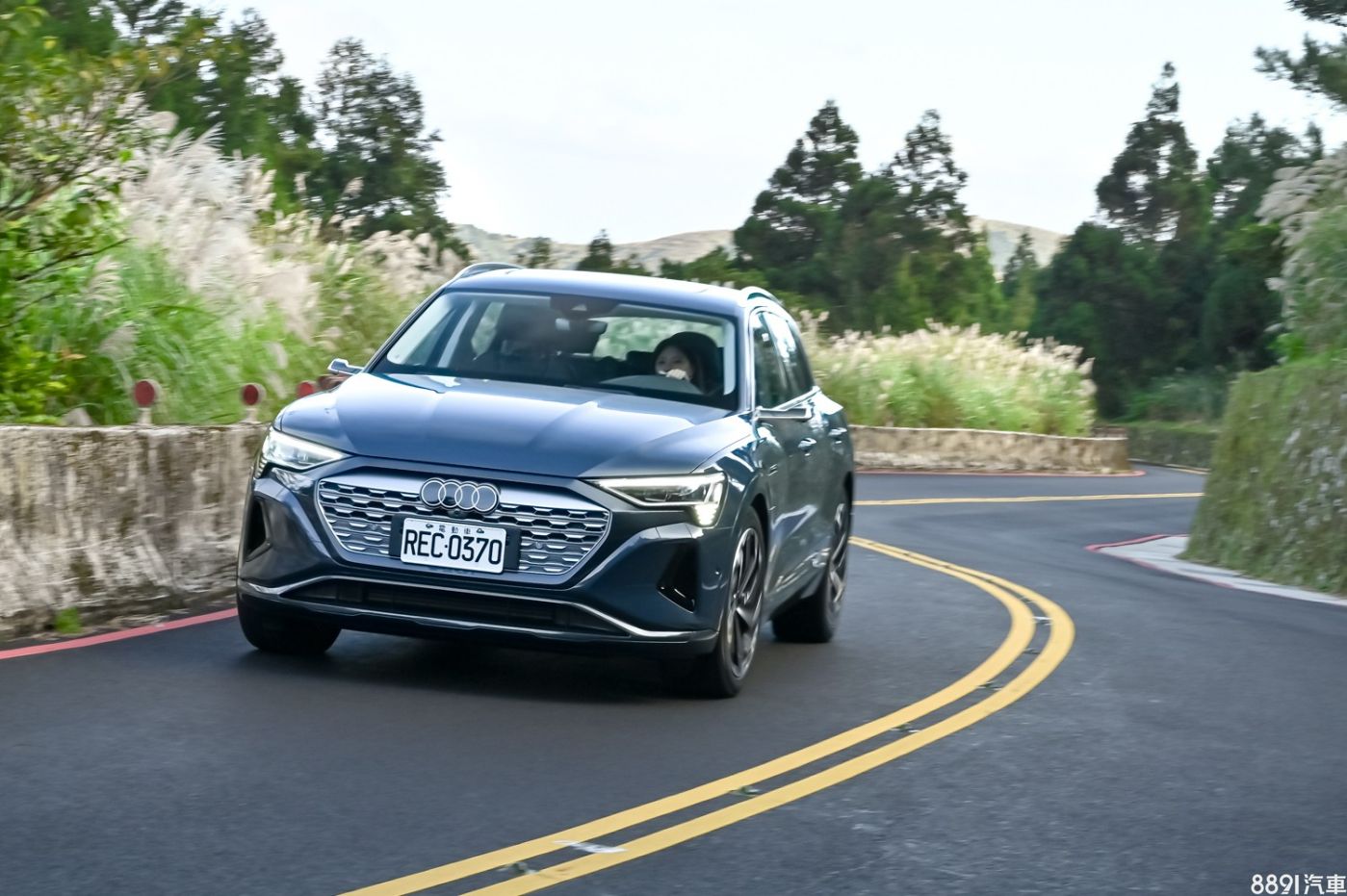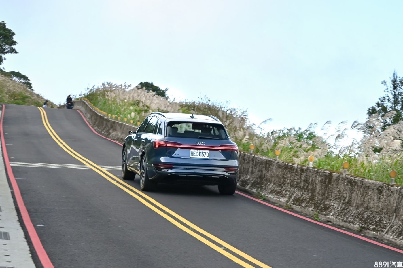 開山路也能體驗到Q8 e-tron的操控感,標配的電子氣壓懸吊,就算處於最軟的舒適模式,轉起來依舊穩健信賴度高,同時也保有一定的路感回饋,若換到運動模式,懸吊支撐性又更好一些,在高達2585kg的車重下也不會不夠用,韌性與Q度恰到好處,如果想稍微開快點,紮實底盤配上飽滿動力,也是能得到不錯的快意駕駛感。