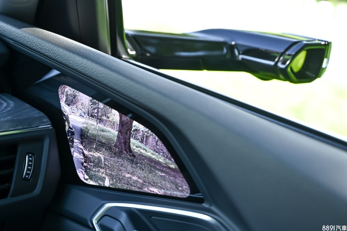 草山小鎮規劃大致還算不錯,但個人覺得最大缺點就是「路沿」設計不良,道路邊緣高低落差過大,就算是高底盤休旅車,輪胎下去估計也是中底盤,有對向會車就得戰戰兢兢,這時Audi Q8 e-tron選配的電子後視鏡便相當受用,畫面清晰度不受氣候、日夜影響,像當天豔陽高照,暗部反差也看得清楚。