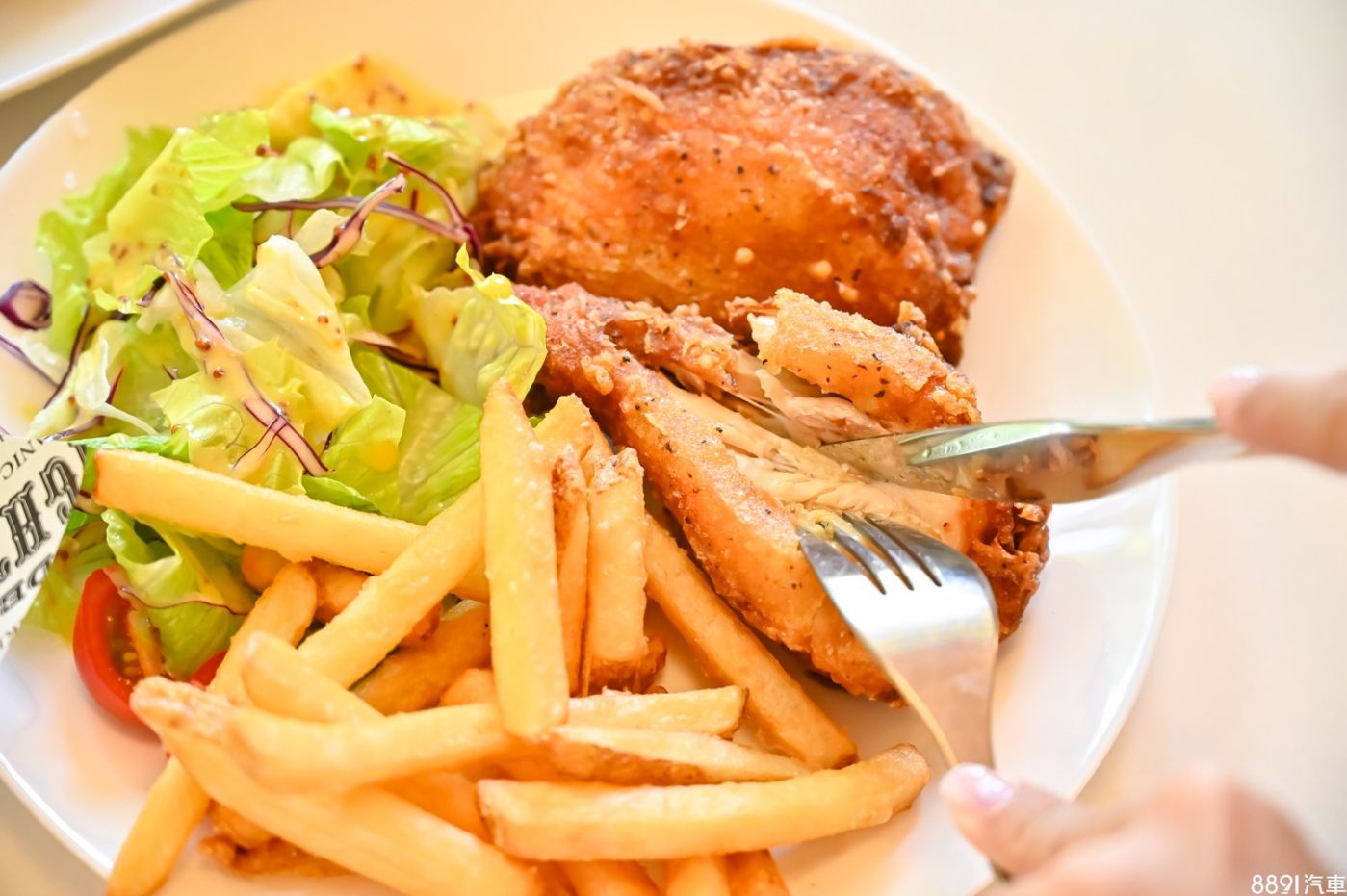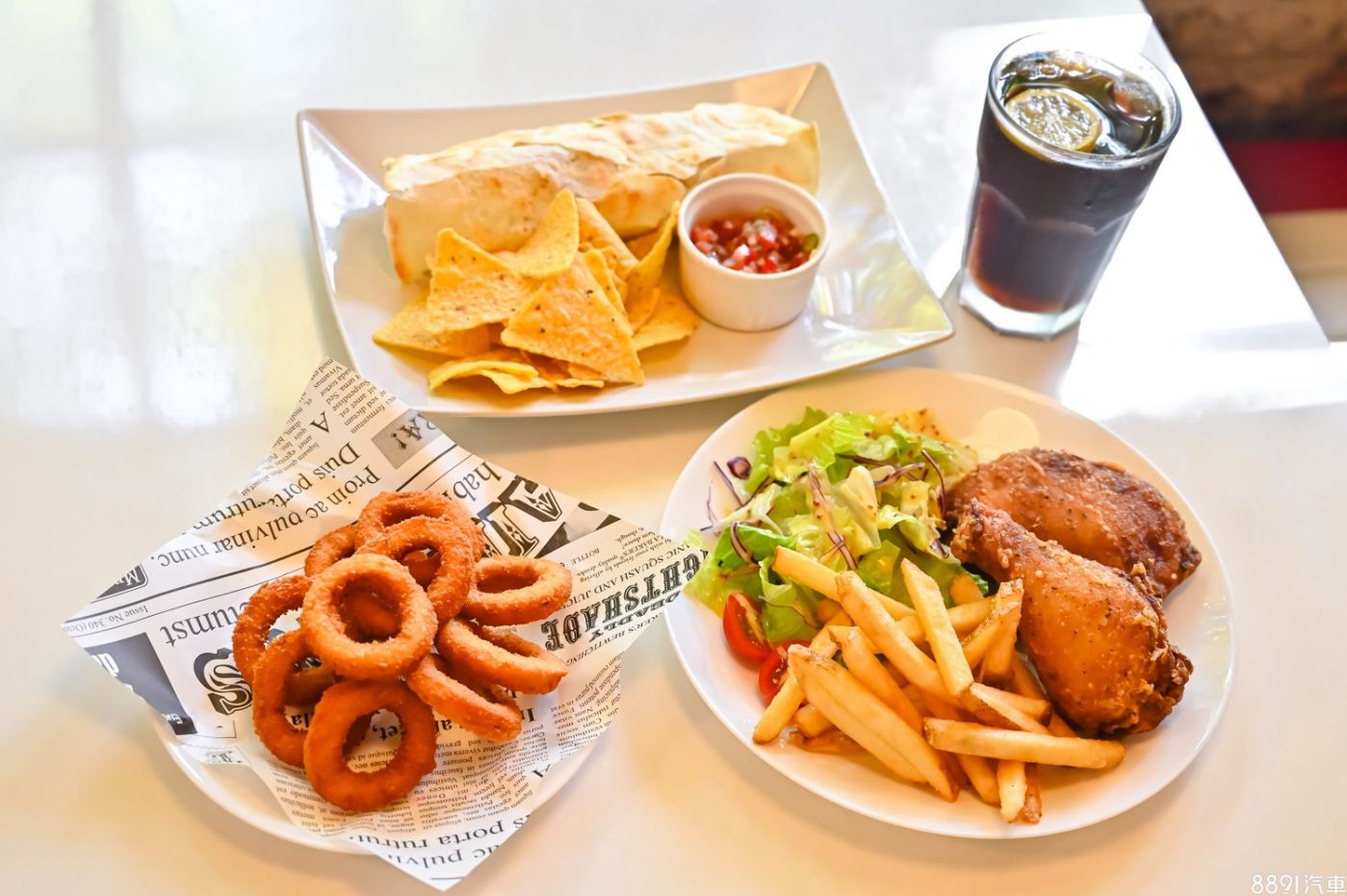 這次只有蓓蓓與攝影師兩人,能裝的食物有限,但來美式餐廳,點炸物絕不會錯,查了下Google評論,最推薦的就是炸雞,所以這次我們點了凱莉炸雞(268元)、墨西哥雞肉捲餅(248元)、酥炸洋蔥圈(98元),餐點都會附上配菜,以份量來說相當有誠意。