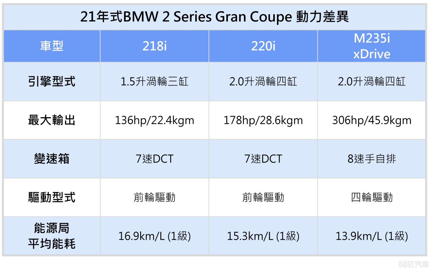 與入門款相比,220i動力較增長了42hp/6.2kgm,不過也因應增加一缸500cc的排氣量,不僅有著較高的稅負成本,15.3km/L的能源局平均能耗也不及218i的表現。