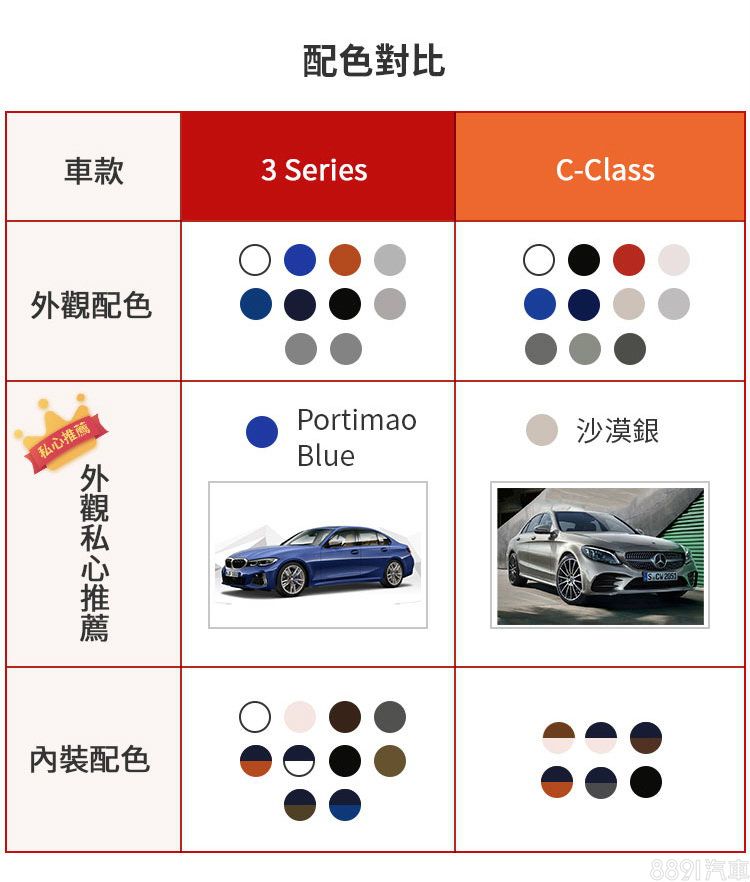 不論是3系列或C-Class,原廠均提供相當豐富的內外配色選擇供車主選換,不過選擇仍以較為主流且保值的灰階色系為主要大宗。考量消費客群和品牌印象,推薦C-Class的車主可選擇低調但具質感的沙漠銀,至於形象較為年輕動感的3系列,與品牌頗為合拍的藍色塗裝應會是不錯的選擇。