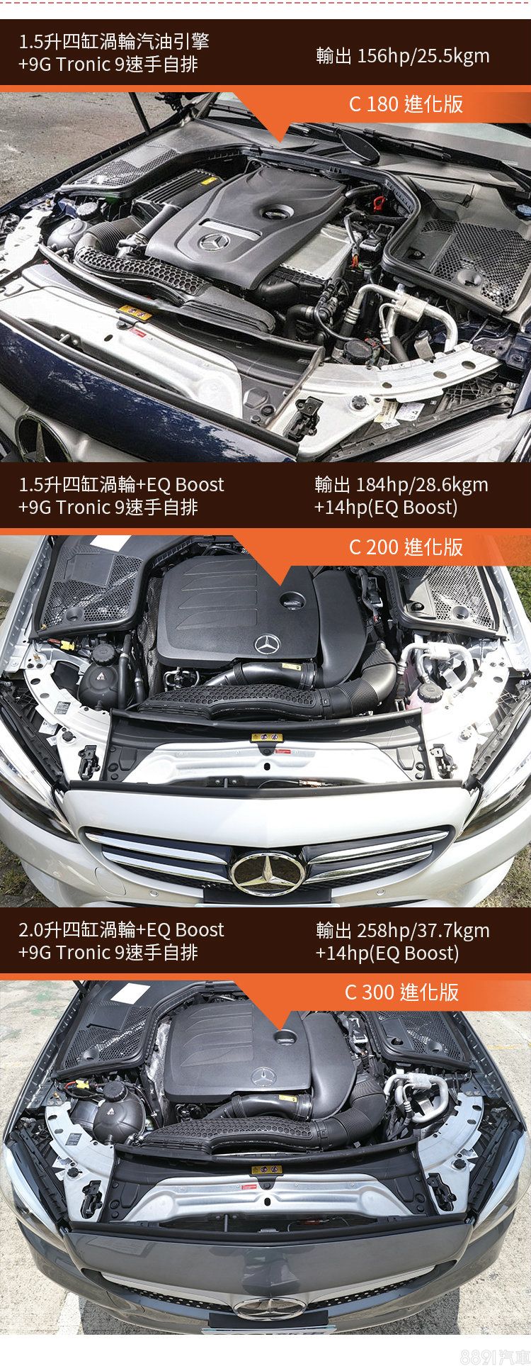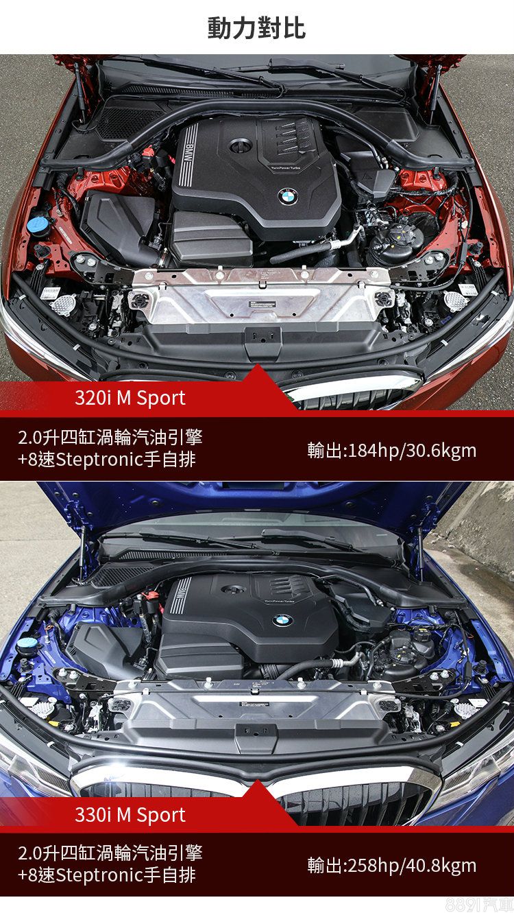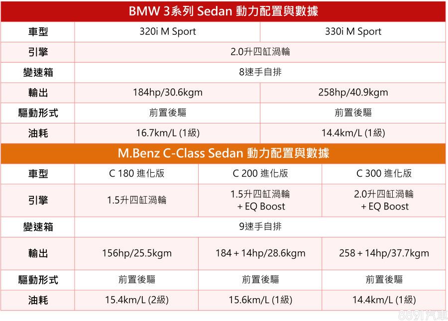 現售的3系列統一搭載2.0升渦輪四缸引擎及8速手自排變速箱,雖說引擎同型,但有著不同的輸出調校,320i為184hp/30.6kgm,而330i則提升至258hp/40.8kgm。C-Class在2018年的小改款上大幅更新動力配置,雖說C 180仍維持156hp的1.5升四缸渦輪架構,而C 200及C 300均換上3年前才推出的新四缸渦輪引擎,除了分別採1.5升、2.0升的排量設定,更一併導入EQ Boost 48V輕油電系統,提供額外14hp的動力輔助,也能夠增進耗能表現以及排汙效果。