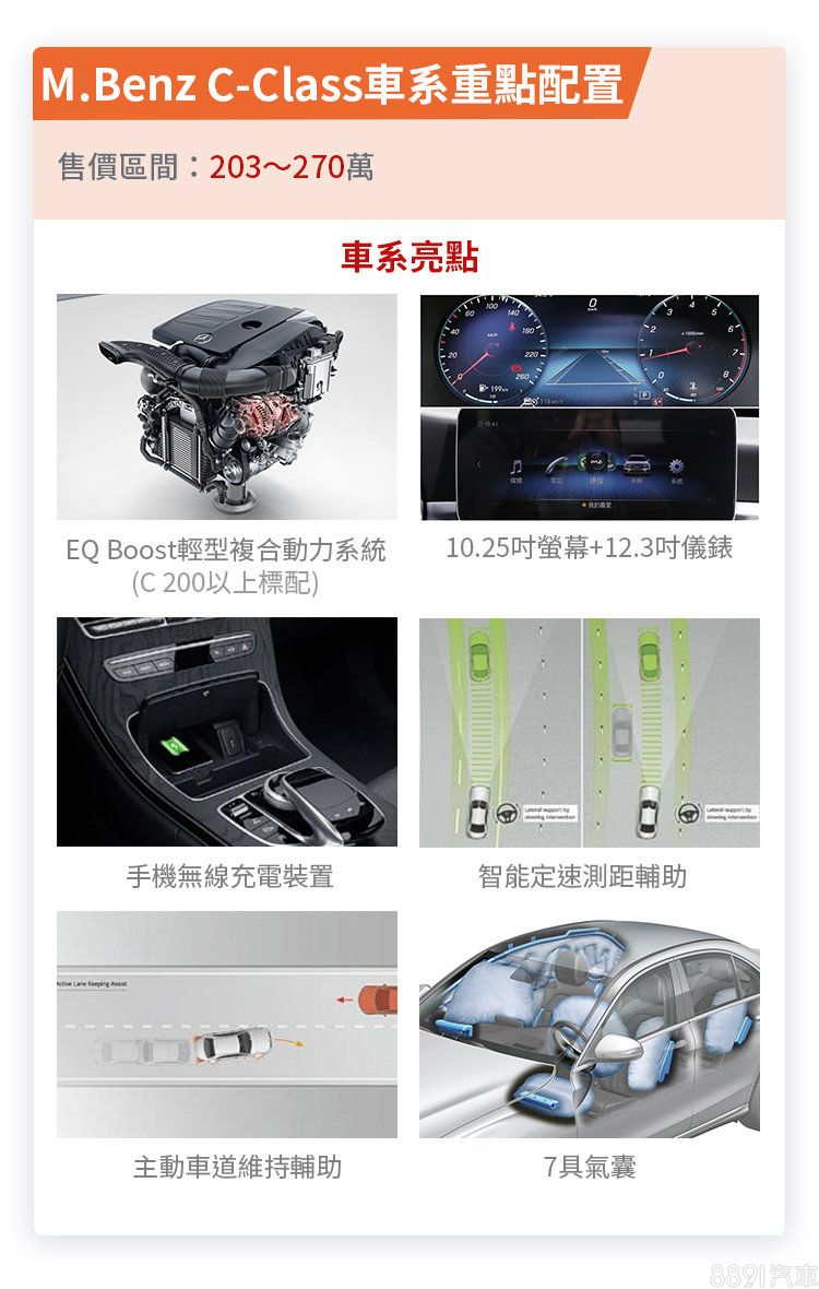 隨動力更新而導入於C 200及C 300的48V輕油電系統,無疑是小改款C-Class的一大亮點,不僅做為節能輔助,同時也是車系的科技賣點。車系將無線充電座列為標準配備,並多出駕駛座膝部氣囊,安全性小勝一些。內裝部分不像新世代賓士車款採用一體式的雙螢幕配置,中央的獨立螢幕有些突兀,但依舊是最新的作業系統,在操作上依舊便利。
