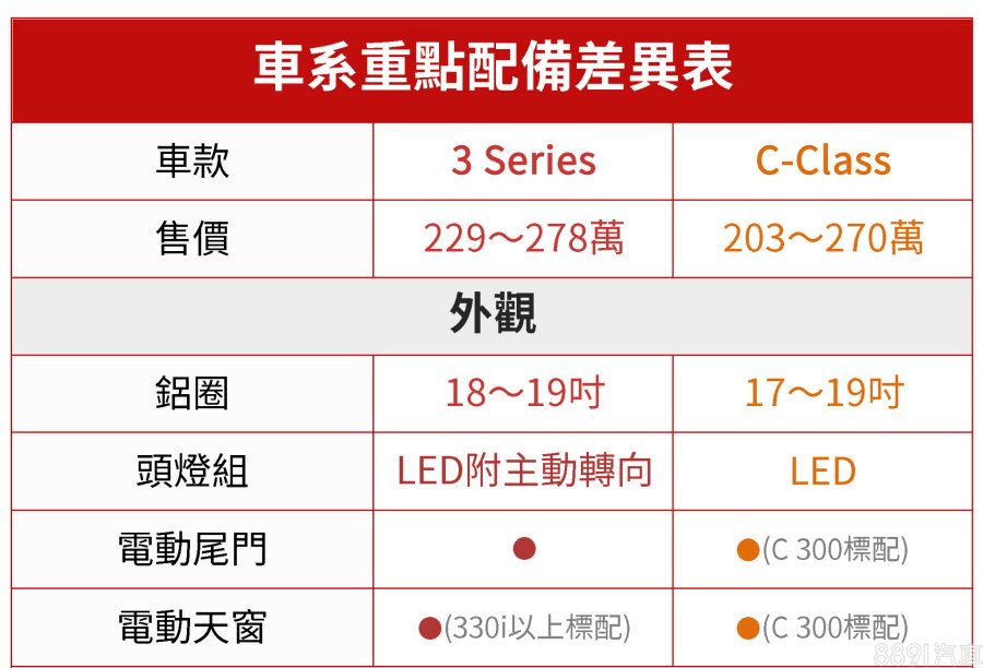 身為豪華車廠銷售主力的中型房車,即便面對SUV產品的風行,仍然留有不少擁護者,同時也是豪華市場中競爭最激烈的級距之一。而級距中最具代表性的3系列與C-Class,不僅長年入榜十大熱銷進口轎車,兩者更是相互纏鬥了將近40年的死對頭!隨著3系列大改款的導入,兩者間的「輸贏」再度成為話題,為貼近消費主流,我們撇除性能導向的AMG及M系列車款,針對兩車系300萬內的編成進行分析,選出兩者間最為划算的選擇!