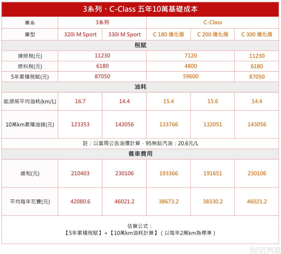 基礎成本主要因排氣量稅額等級劃分而有所區別,C 180及C 200兩款1.5升車型,平均年度花費均能壓在4萬元以內,不過其餘車型雖說所需成本較高,實際上各車型間差異並不顯著。