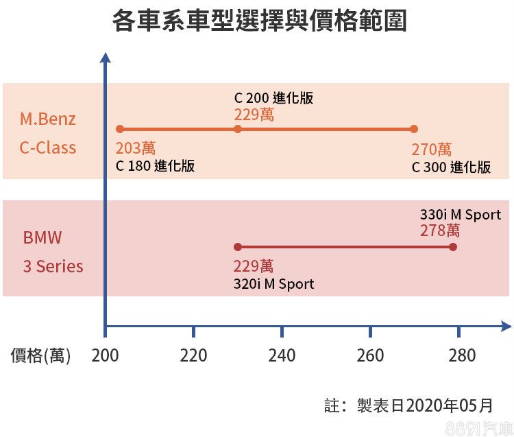 兩車系300萬內編成清一色配置了直列四缸引擎,不過排氣量在賓士陣營有1.5升以及2.0升兩種選擇,而兩者的價格帶也相當接近,其中等級相當的C 200及320i有著相同定價,更有著直接對決的感觸。雖說C-Class提供較入門的C 180下探200萬出頭的價格帶,不過國外已發表的318i也預期後續將會導入以補齊入門戰力。