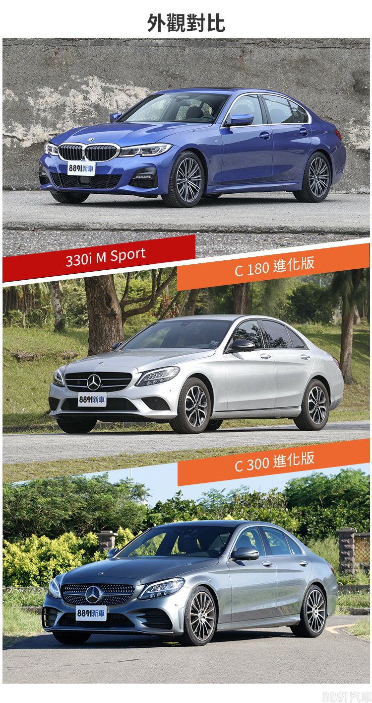 大改款3系列有著較前代更為銳利流線的線條,立體式燈殼頗具辨識性。目前國內販售車型統一標配M Sport套件,與品牌運動化的形象頗為契合。C-Class整體來說較3系列多了點成熟氣息,隨著進化版的推出,C 180標配Avantgarde外觀套件,其餘車型則搭載AMG Line外觀套件,營造更運動化的視覺形象。