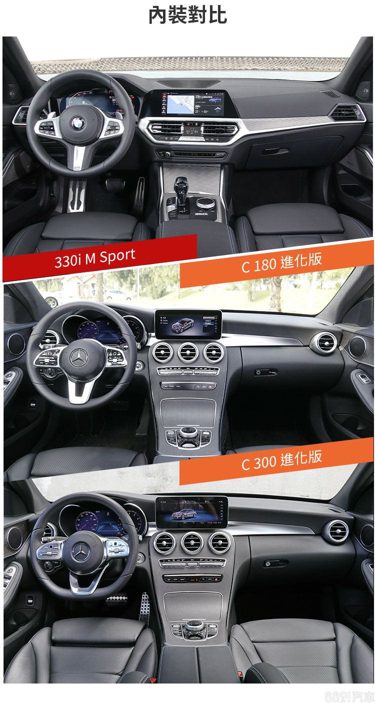 兩車系均標配12.3吋數位儀錶和10.25中央觸控螢幕,分別所搭載的BMW OS 7.0及MBUX系統更被外媒評選為主流市場中最好用的兩大車載多媒體系統。設計上,3系列仍維持品牌一貫的駕駛導向風格,並有效運用視覺線條營造橫向寬闊感,至於C-Class則以左右對稱的造型做視覺呈現,整體上走著相對保守的氛圍。
