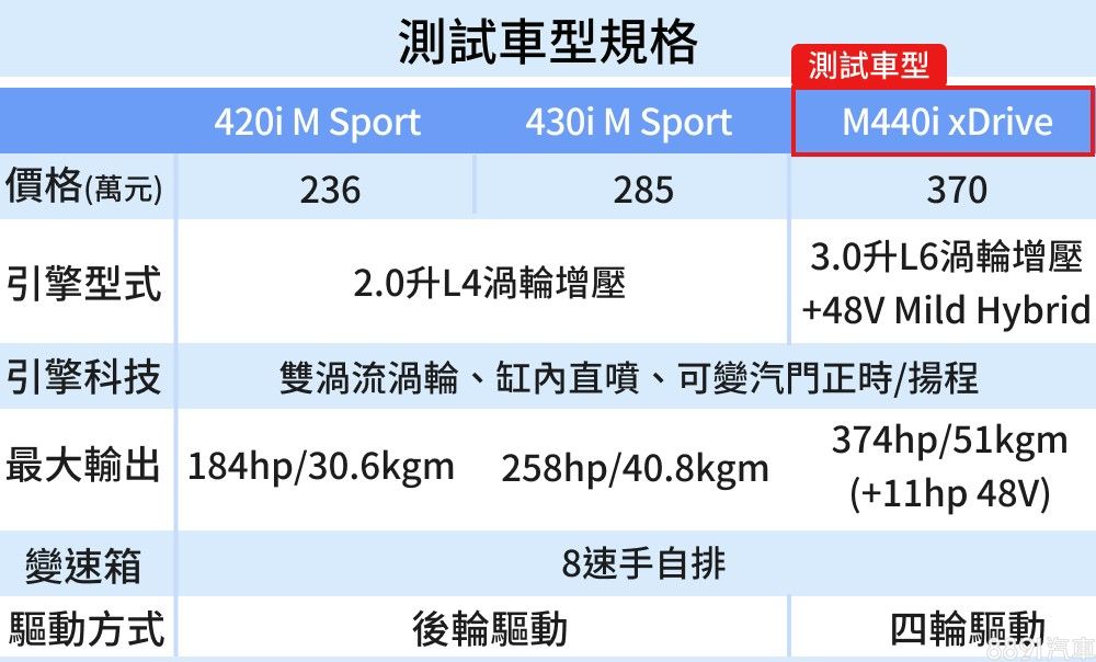 攤開國內4 Series車型,420i與430i皆採用相同的2.0升四缸渦輪動力,僅有高低輸出版本差別,兩者也都將M Sport套件列為標配並採後輪驅動配置。此次試駕的M440i定價則高出一截來到370萬元,經過M部門調校的直六渦輪可輸出374hp/51kgm動力,並加入48V微油電輔助,科技層面極高,M440i更採用xDrive四驅系統,比純後驅設定更能提供全天候的戰鬥力。