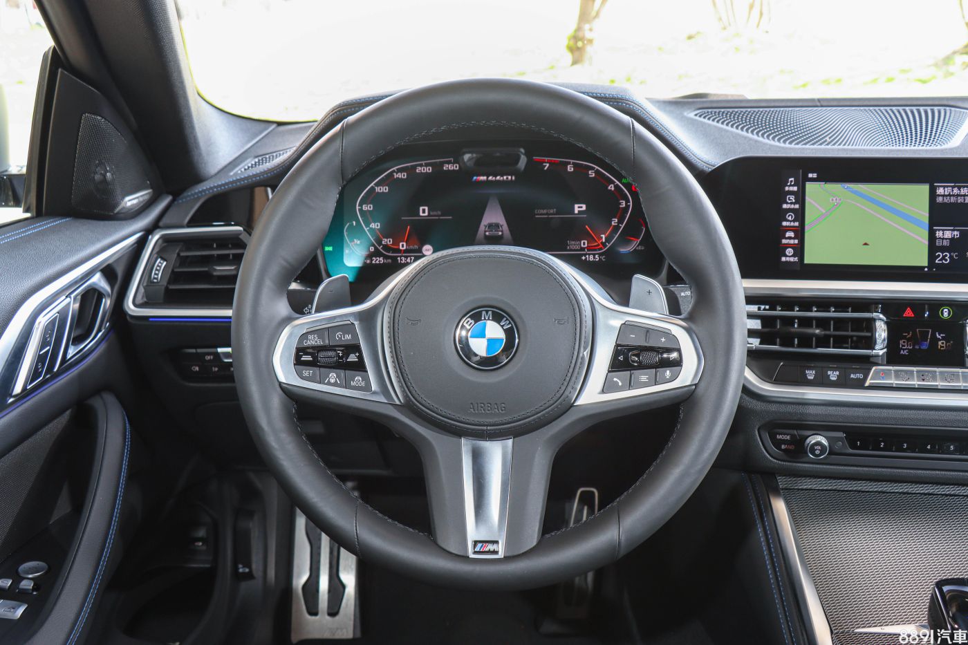 M款方向盤為全車系標配,以符合跑車產品定位,握感偏向厚實柔軟,後方也配有換檔撥片,方向盤左邊可設定主動車距跟車系統,右邊則為多媒體相關操作。