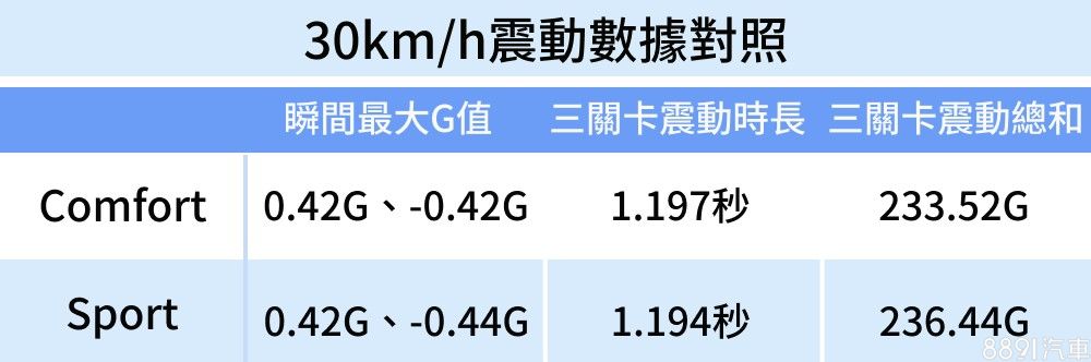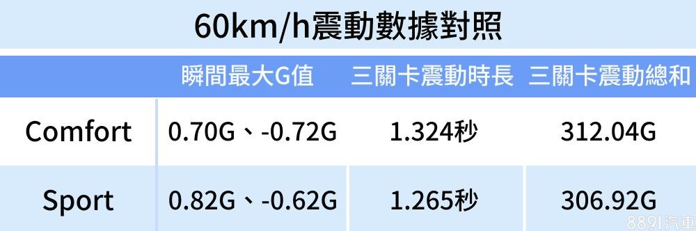 透過表格對比低速Comfort、Sport模式的差異,可以看到三項數據都表現相近,且開在路上確實沒有太明顯的差別。