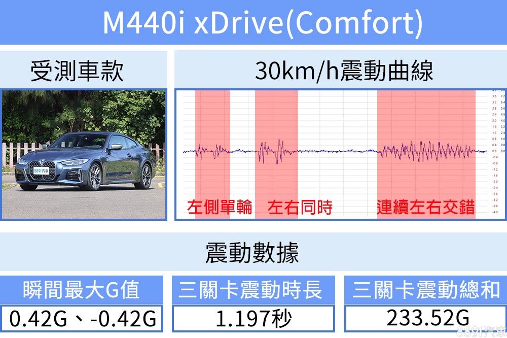 M440i搭載M款跑車化電子懸吊,整體調校偏向運動化,並具備Comfort、Sport兩段阻尼軟硬調整,Comfort模式下衝擊感不算強烈,車身回穩速度也很快,但底盤回饋仍是直接,觀察曲線可以看出車身每次起落都逼近正負0.4G,面對連續路面起伏感受相當鮮明。