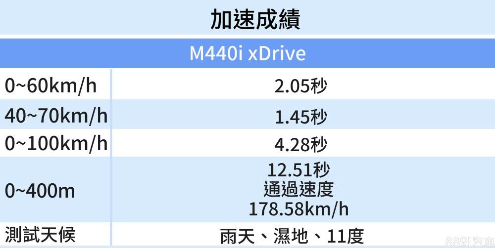 測試當天雨勢不小、路面積水橫流,M440i的電控、四驅系統表現出色,四輪沒有絲毫猶豫車身便彈射而出,初次嘗試便輕鬆創下4.5秒加速百公里加速成績,後續每一趟測試也都穩定落在4.3~4.5秒之間,不受濕滑路面影響,表現出色。過程中引擎聲浪激情,推力從低轉一路攀升,到升檔前都不見顯著衰退,配上Sport Plus模式換檔強烈接合感,又快又過癮。