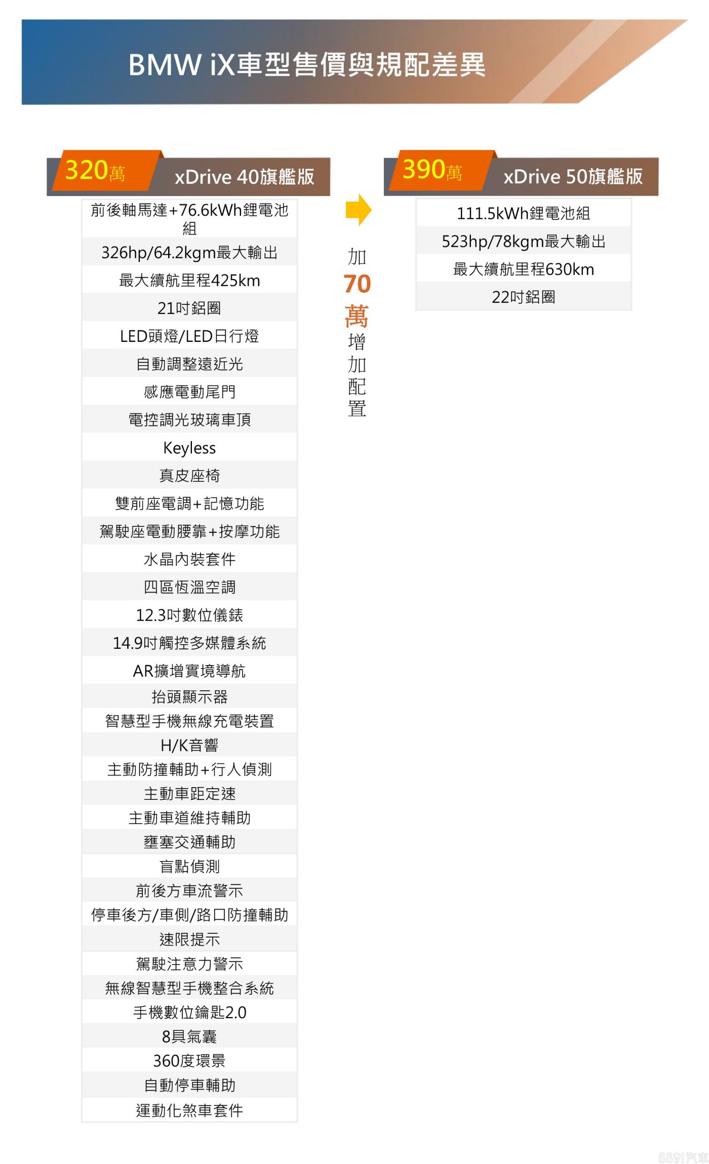 目前BMW在台提供xDrive 40旗艦版(此次試駕的版本)、xDrive 50旗艦版兩車型,分別開出320、390萬元之售價,拿同級距品牌油車的X5來看,iX相當於二階X5 xDrive 25d旗艦版的入手價,畢竟現在台灣市場普遍來說,同品牌同級距的電車售價,往往會比油車高出不少,此番操作無疑冀望增加消費者選購的意願,搶市意圖明顯,此外,目前國內也展開了iX M60的預售(預售價620萬),正式發表可能得等到下半年。