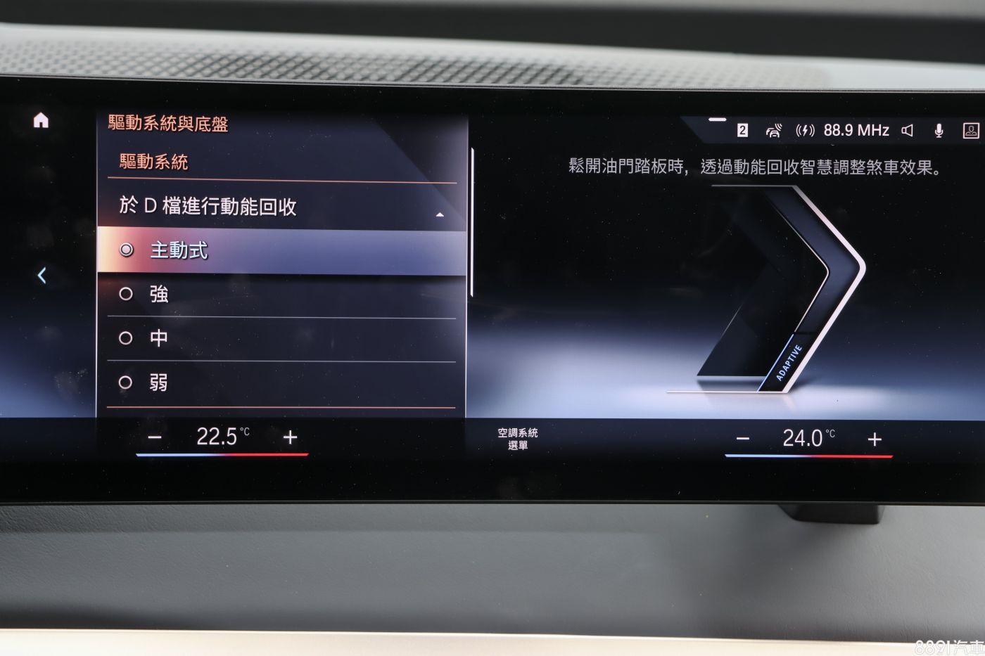 iX的動能回充系統不像多數品牌使用換檔撥片調整強度,得由多媒體系統操作,有主動式、強、中、弱四段選項,回收力道最小的設定,能給人十分貼近開油車的使用感受,比較想特別提出的是「主動式」選項,前方車多與車少時,能明顯感受到回充力道的強弱差異,但又自然到你不會覺得突兀。另將檔位切換至B檔,則為單踏板控制加減速模式。