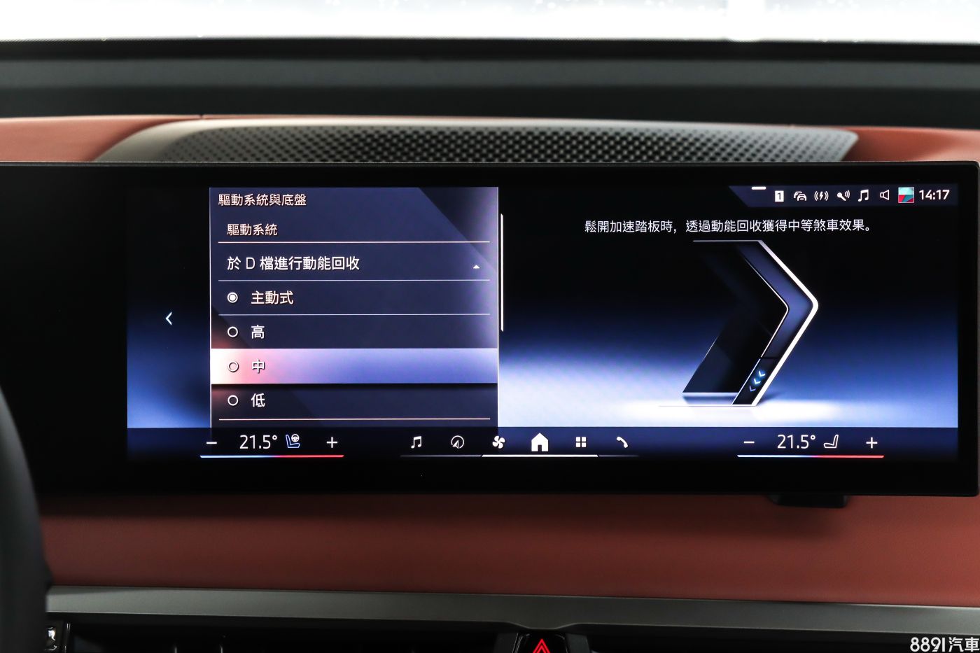 動能回收需要從中央螢幕操作,主動式是我最推崇的,系統會視跟前車距離、相對速度等因素,主動判斷動能回收力道,實際使用相當聰明精準,當放開油門滑行時,會視前車減速狀況,持續微調回收力道,且線性自然,非常好用!