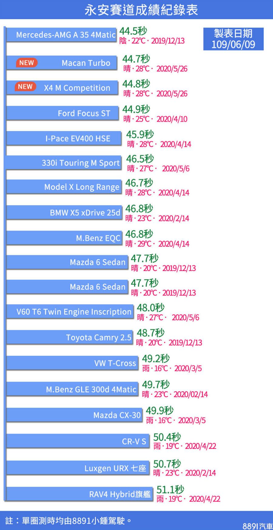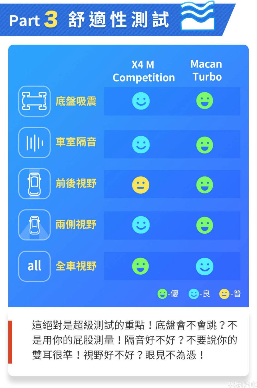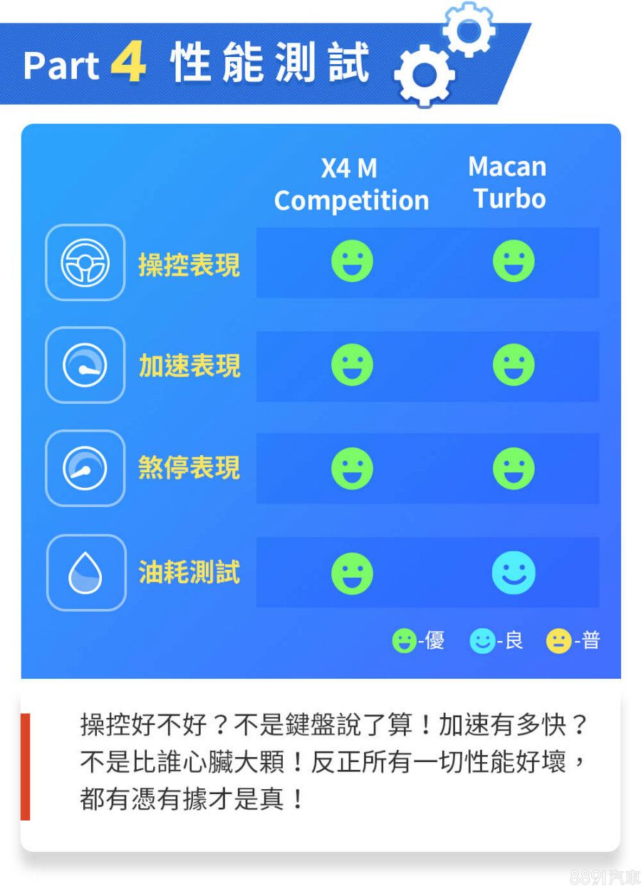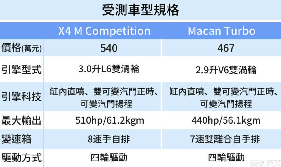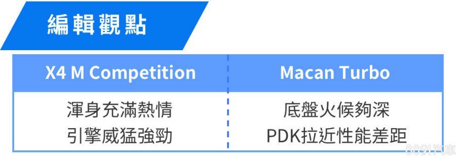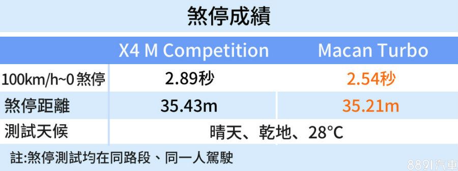 看到兩車的各項加速成績,Macan Turbo僅有初段0~60km/h勝出,其他部分都不如X4 M Competition,顯現馬力更大的優勢之外,40~70km/h跟變速箱退檔反應也有關係,就算X4 M Competition的自排沒有PDK變速箱那樣犀利,但這也是同場比較才有的高低之別,性能表現絕對禁得起考驗!