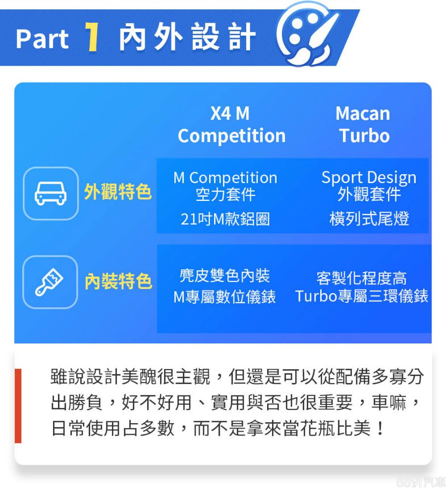 和路上常見的2.0升版本最大的區別,Macan Turbo前保桿採用更大的進氣口造型,後方尾翼設計也是專屬配置,除此之外,試駕車也將Porsche高度客製化的機制徹底發揮,包含Sport Design外觀套件(8.05萬)、深色PDLS高階LED頭燈(5.12萬)、蠟灰車色(13.87萬)、全景天窗(9.41萬)、碳纖維車側飾板(3.55萬)、黑色窗框(1.18萬),體現要彰顯個人品味就得付出對等代價的遊戲規則,相比之下,X4 M Competition雖然標配更豐富,但選配項目就比較單調一些。