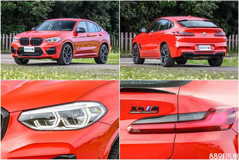 M Car總能提供有別一般BMW車款的氣勢,X4 M Competition採用專屬的前、後保桿造型,擁有擾流鰭片的後視鏡也是M Car招牌特色,並配置黑色高光澤外觀套件,在鮮豔的紅色塗裝有高對比視覺感,加上大口徑的四出排氣管設定,比同場的Macan Turbo更有殺氣,是輛充滿武車氣息的斜背跑旅。燈具部分均為LED光源,標配有主動轉向、主動光型控制的智慧型頭燈,看起來也比一般版本有精神,符合車系旗艦身份。