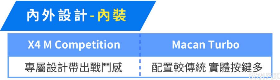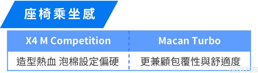 Macan Turbo雖然車內空間不及X4 M,但有較低的開口高度,開門幅度也更大,而且門框造型比對手方正,進出較為方便一些。