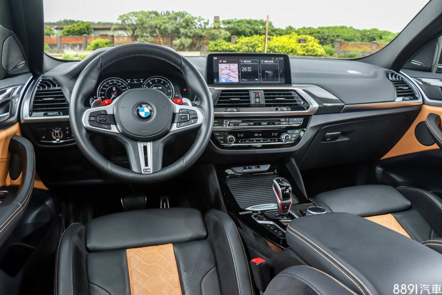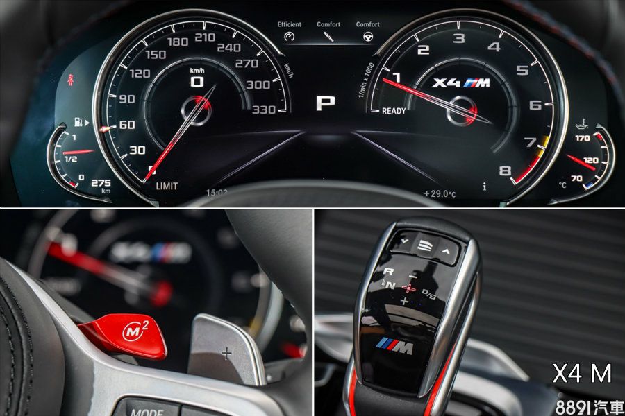 標準的雙環式數位儀錶簡約易判讀,重點在於中央能夠提供動力、懸吊以及轉向回饋等項目所處的模式,而方向盤上鮮紅色的M1/M2快捷鍵頗為實用,便於快速轉換至自訂的行駛狀態,而且和紅色引擎啟動鈕都增添戰鬥氣息,至於專屬排檔桿使用方式和其他BMW車款不同之外,上頭還有三段換檔速度的調整按鍵,和一般X4有明顯區隔,表明是輛正宗武鬥派的M Car!