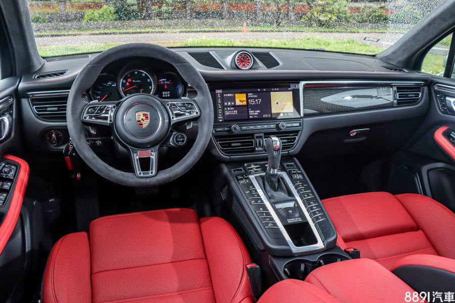 Porsche的選配項目豐富、客製化程度高,項目多寡能讓車有截然不同的風情,此部試駕車在內裝部分主要選配黑/紅雙色真皮內裝(1.32萬)、GT跑車方向盤麂皮包覆(5.96萬)、碳纖維內裝飾板(4.95萬),塑造出豪華感十足的運動風,也由於現行款Macan已問世多年,還是先前大量實體按鍵的架構,不過這也一樣取決於選配數量,中央鞍座兩旁滿檔的「財力證明區」,想必心中也會產生一股優越感。