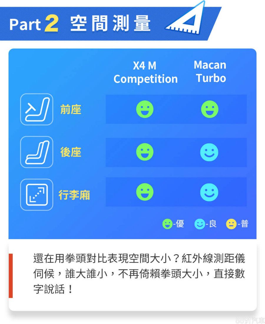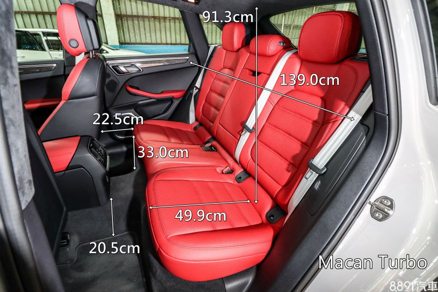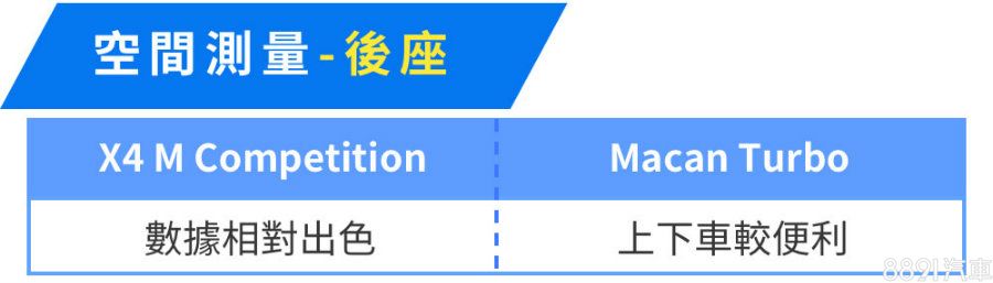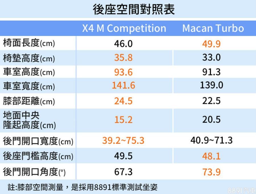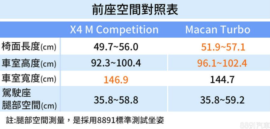 本次評比車型都屬中型休旅,在前座空間都有不錯表現,數據伯仲之間,以X4 M來說,146.9cm的寬度表現略勝對手,Macan Turbo則有更好的頭部空間。但實際乘坐的感受上,Macan Turbo受到中控台、排檔座設計較高聳所致,有種不像坐在休旅車裡的錯覺;X4 M則偏向傳統休旅,座點高、視野好,體感當然更開闊一些。