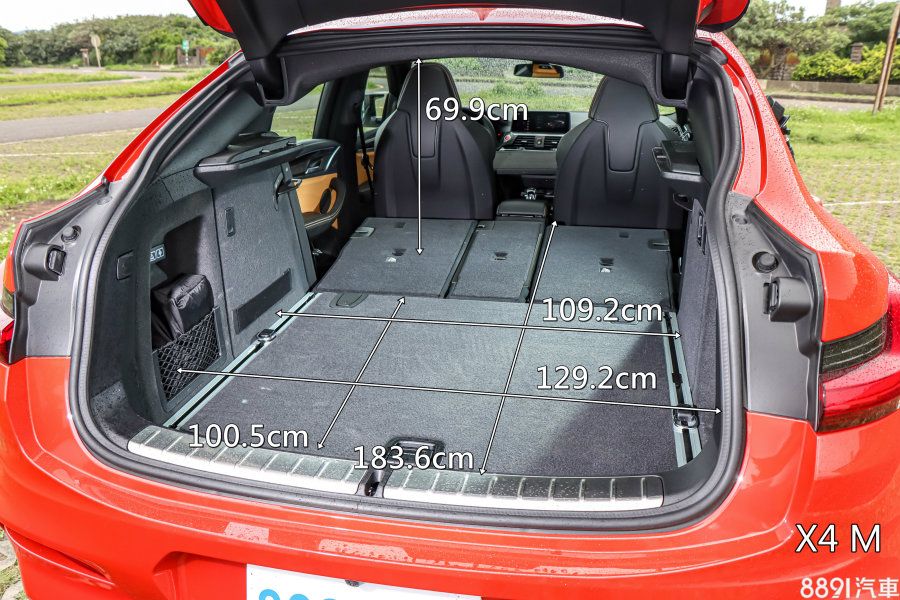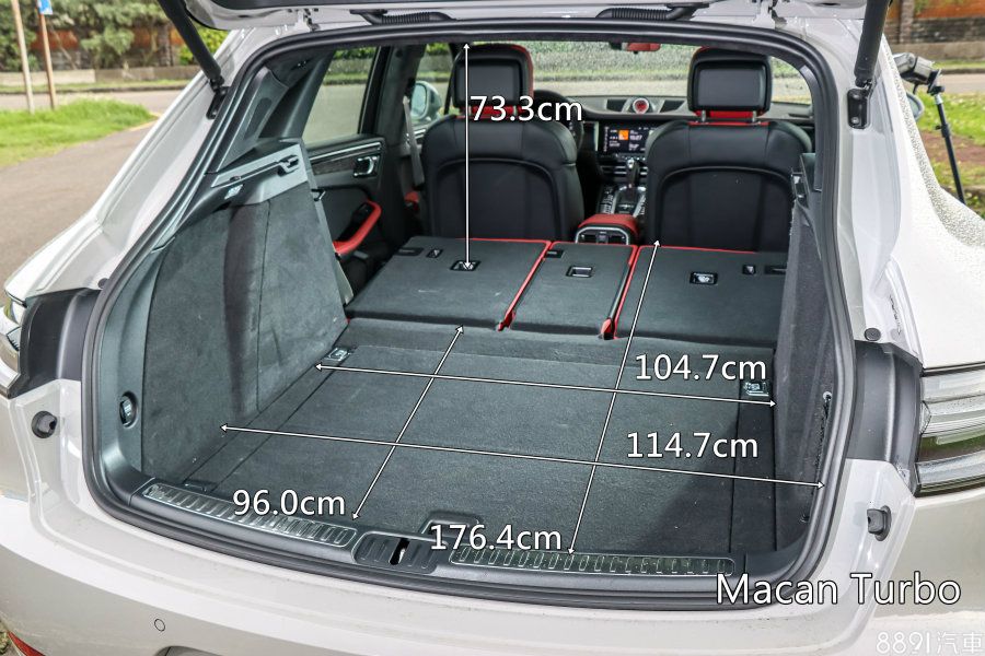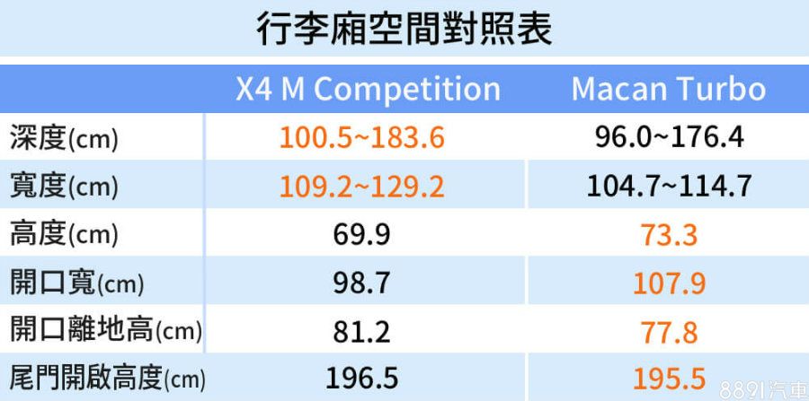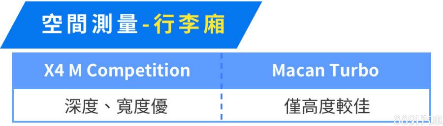 兩者在後座椅背放倒後,行李廂底板都相當平整,在測量數據部分,X4 M贏在寬度、深度表現,高度則是Macan Turbo更好,要注意的是,雖然兩者都屬「跑旅」,但X4 M車尾線條更「流線」,車廂後半部的高度難免受到一些限制,像是冬天穿短裙的辣妹一樣,追求亮麗外型的代價。