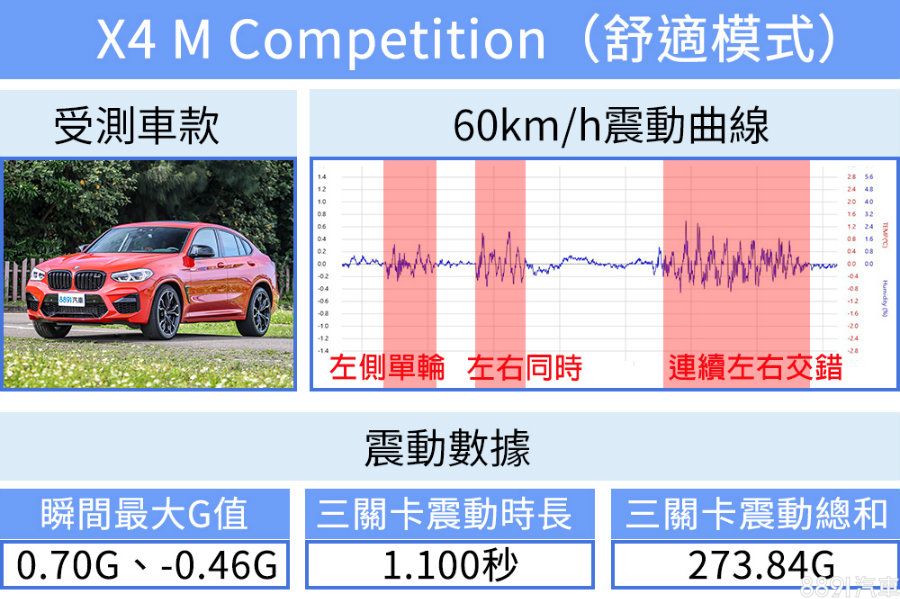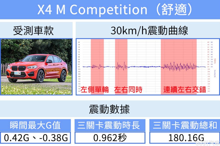 X4 M Competition就是輛武車,電子懸吊設定硬派、回饋直接,這是在路上開就能明顯感受的事,以懸吊「舒適」模式進行30km/h測試,除左右同時關卡衝擊感強之外,通過連續陣型車身搖晃感也不小,數據顯示則略遜而對手。