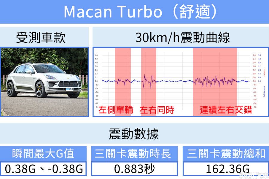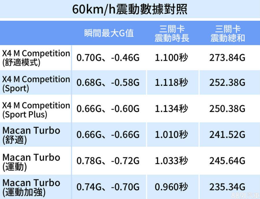 這次我們也依各車三種不同懸吊軟硬進行測試,以X4 M來說,在最激烈的Sport Plus模式下,反而成績表現比「舒適模式」還好,主要是震動時長更短,車身回穩速度更快,讓G值總和更低;至於Macan Turbo三種模式差異不算鮮明,但在舒適、運動模式下數據皆優於X4 M,體感上也更為平穩。