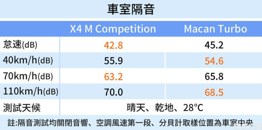 兩車隔音表現可說是各有勝負,怠速時Macan Turbo車內仍會傳來隱約排氣聲浪,X4 M則相對安靜些許,這樣性能感的聲音點綴喜歡與否就見仁見智。隨著車速提高,兩車的隔音表現都符合豪華品牌水準,尤其Macan Turbo在110km/h測試中底盤噪音抑制良好,對比之下X4 M的胎躁便稍嫌明顯一點。