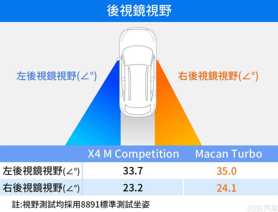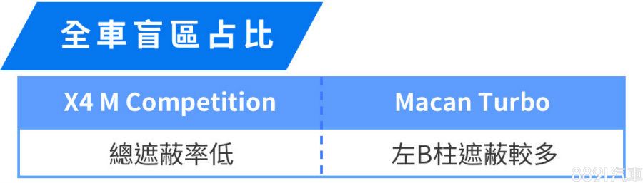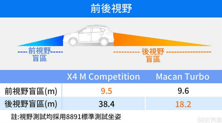 兩車前方視野表現相當,9.5m、9.6m的視野盲區並不算太短,與兩車車頭造型都相對高聳、修長有關;後視野則與車身造型息息相關,X4 M後方斜背造型顯著影響後窗面積與視野表現,後視野盲區因此來到38.4m,表現並不出色。